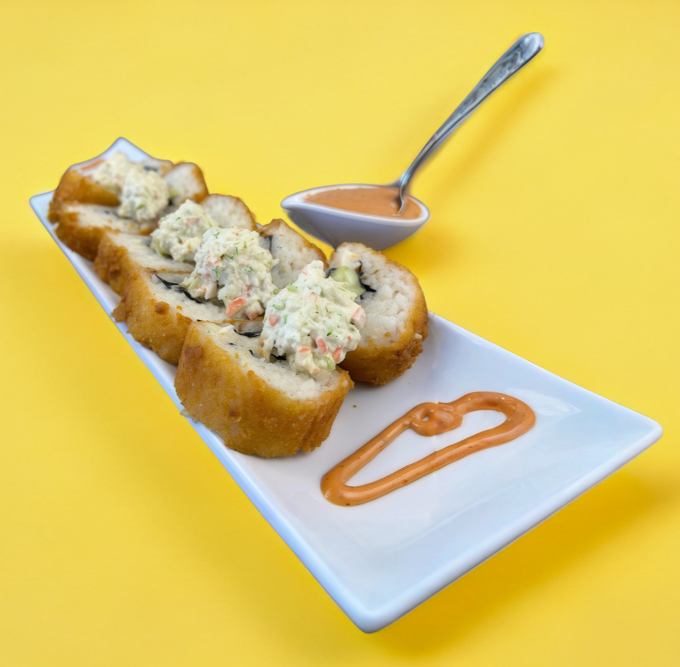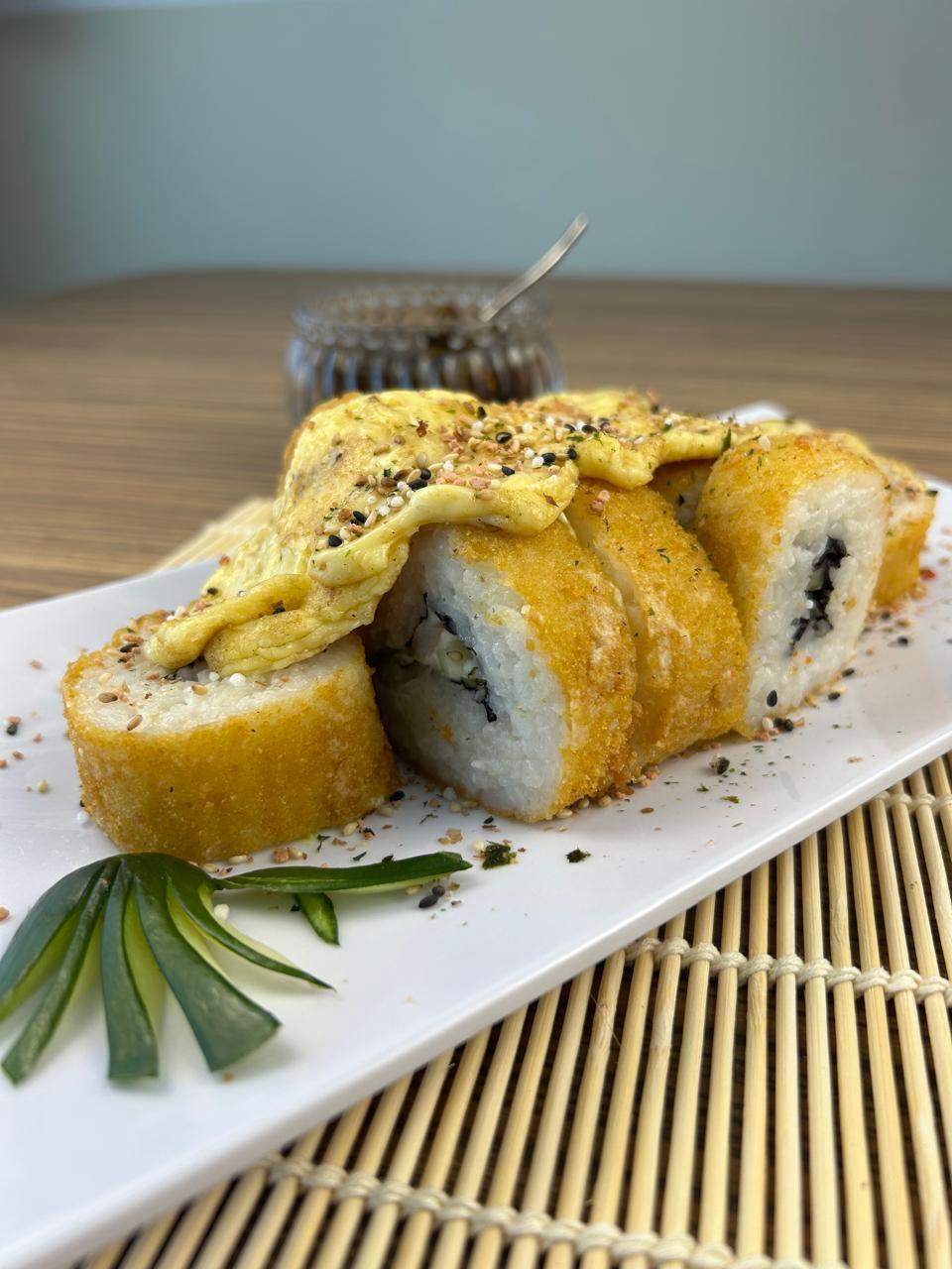 Camarón empanizado o sirloin, pepino, queso Philadelphia, por fuera bañado en salsa de chipotle.
