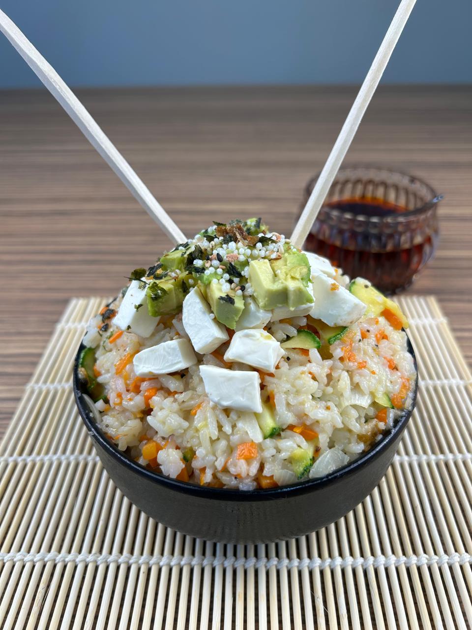 Verduras a la plancha, calabaza, brócoli, cebolla, pimiento morrón, coliflor, germinado de soya con arroz mixto.