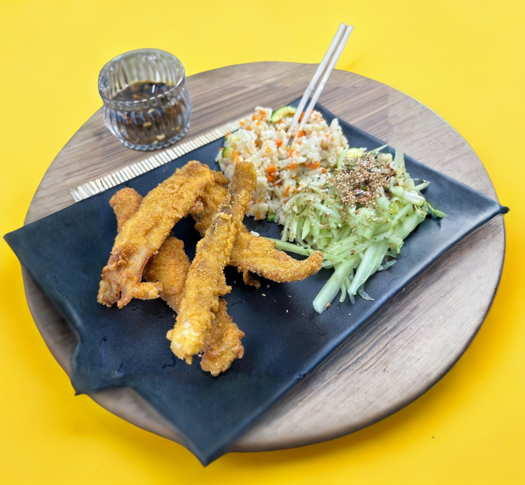 Pescado empanizado o a la plancha, arroz y ensalada de pepino con cangrejo. Incluye refresco y salsas.