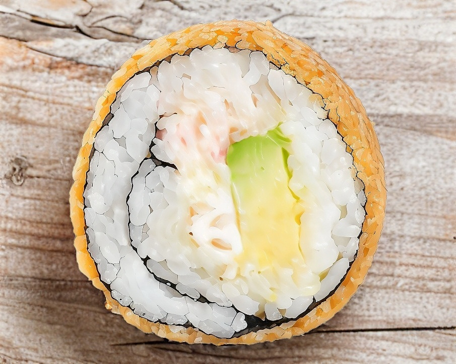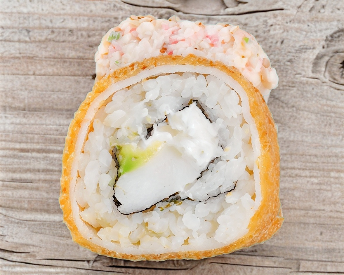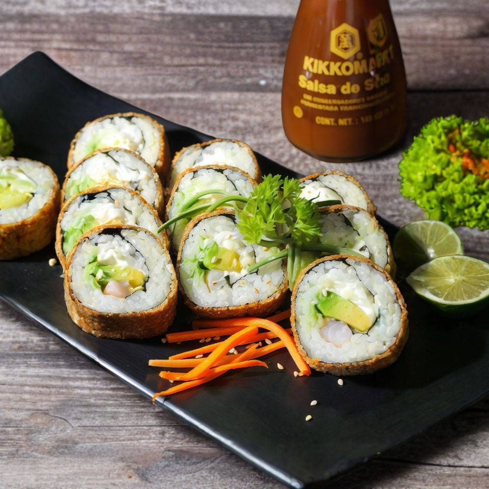 Camarón empanizado, aguacate, queso Philadelphia y salsa chipotle.