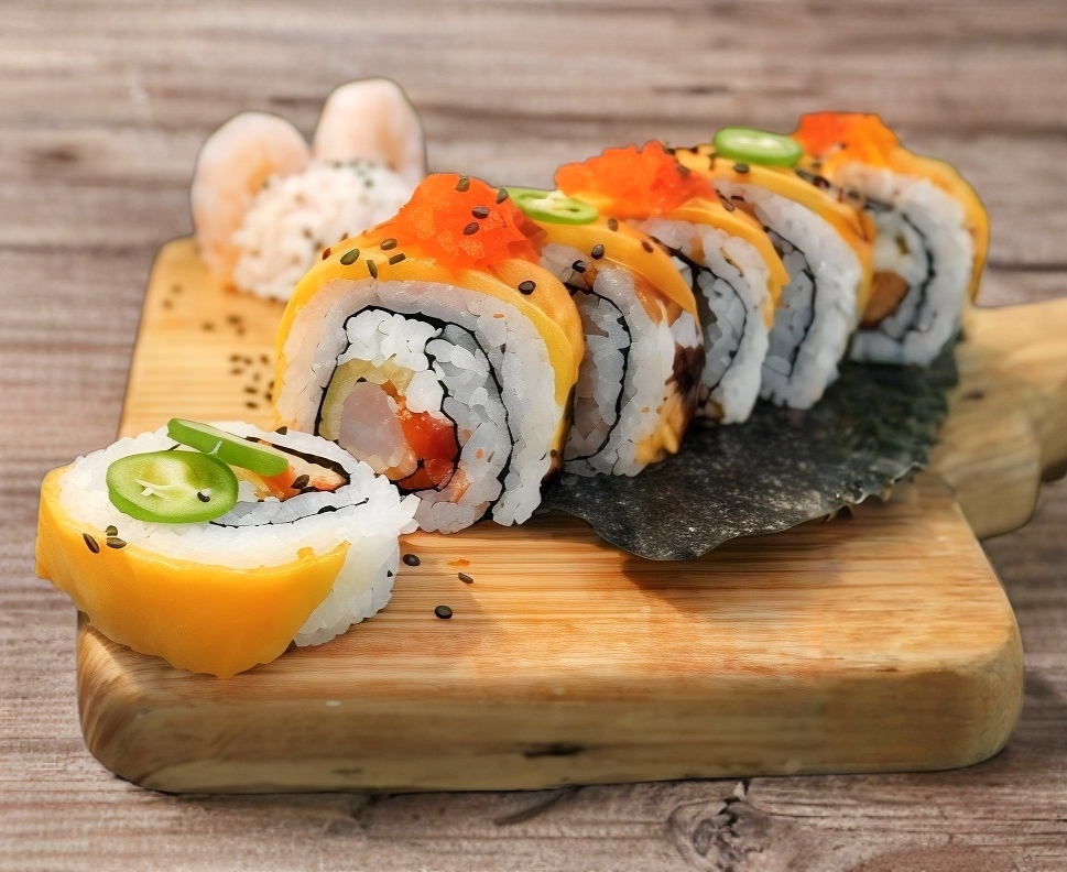 2 ROLLOS de Camarón gigante, salmón, queso Philadelphia, aguacate.