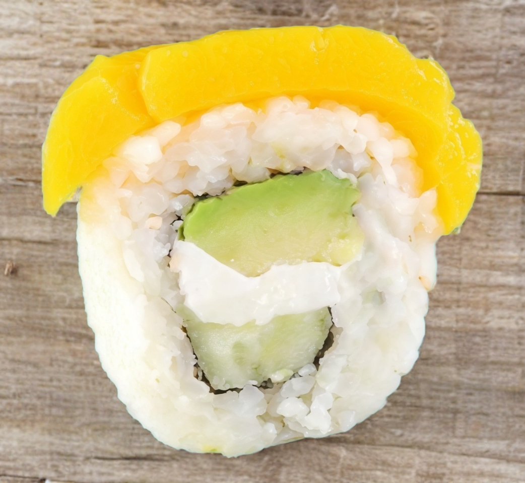 2 ROLLOS de Queso Philadelphia, pepino, aguacate. Por fuera: Mango (disponible por temporada).