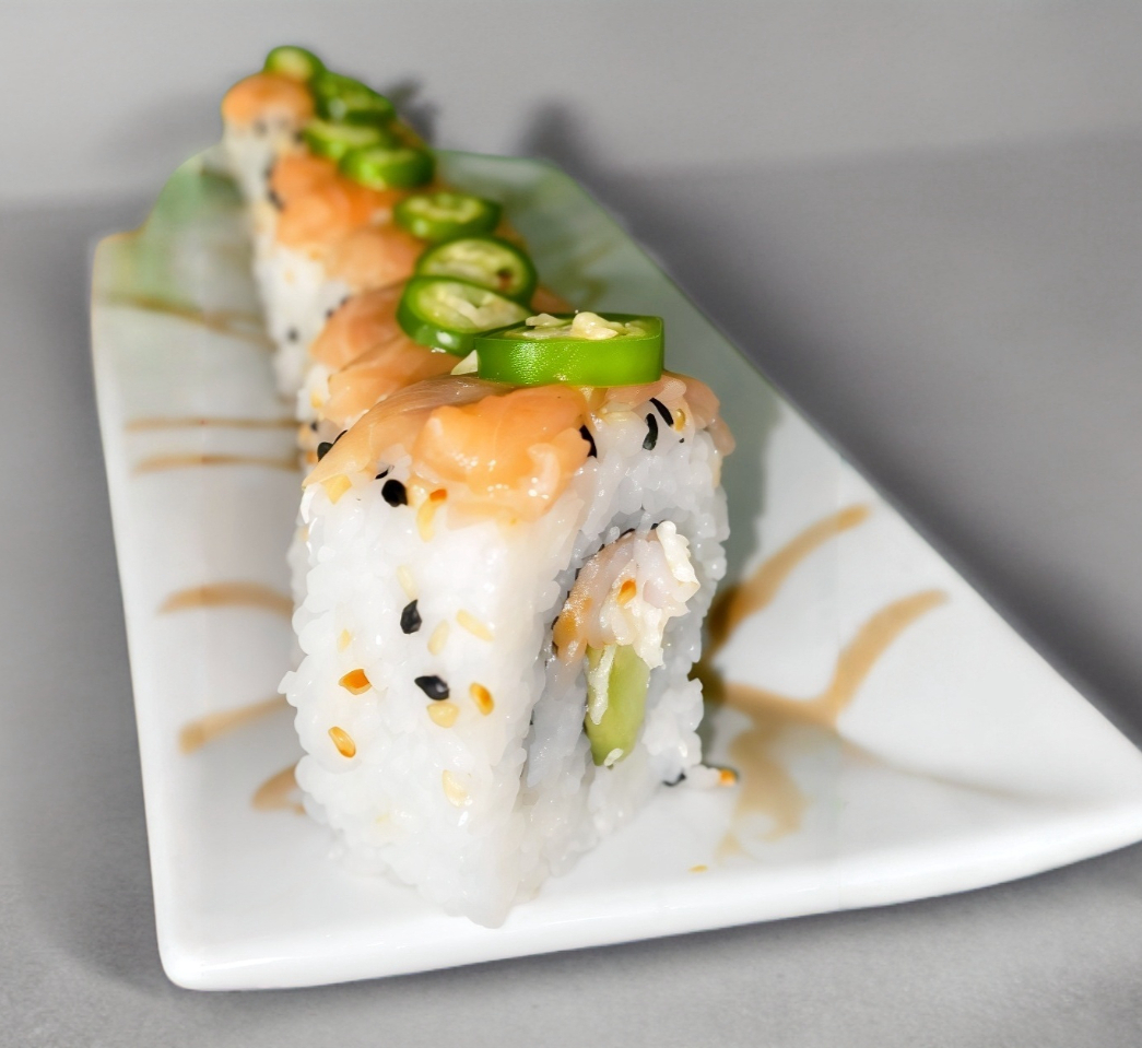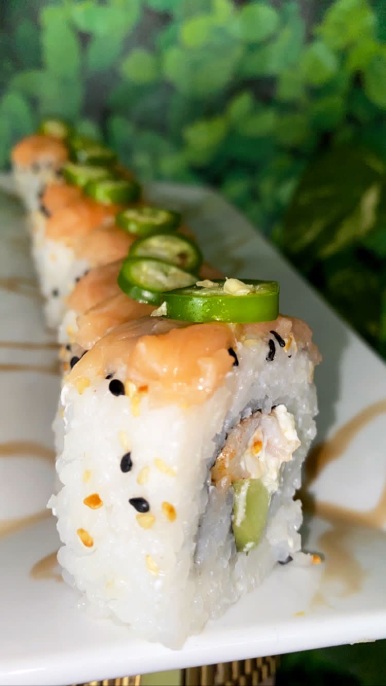 Camaron Empanizado, Pepino y Queso Crema por fuera Salmon, Chile serrano y Ajonjolí mixto