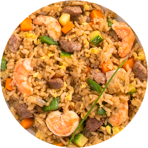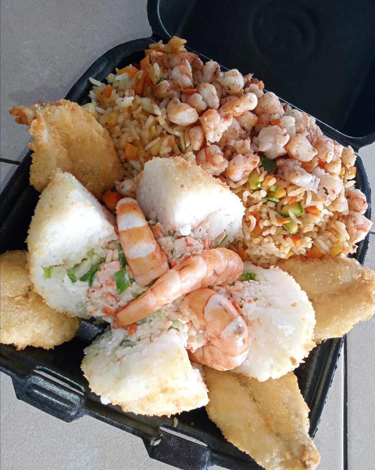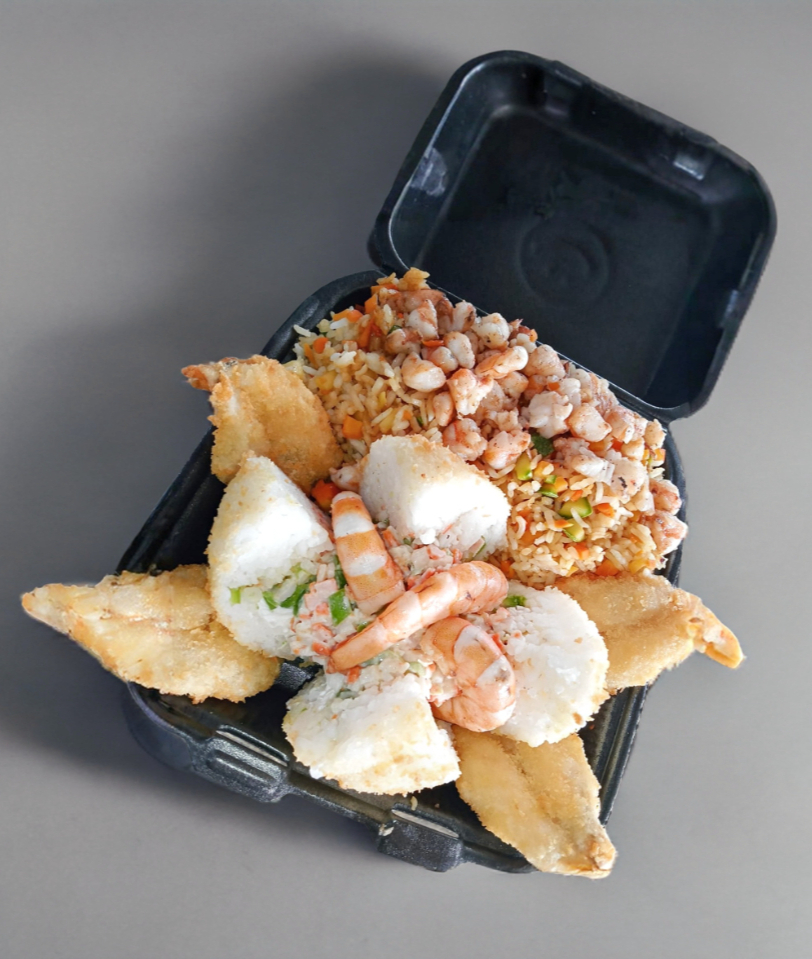 Bola de Arroz Sencilla (proteina a elegir) + Yakimeshi Especial + Camarones Empanizados + Tampico