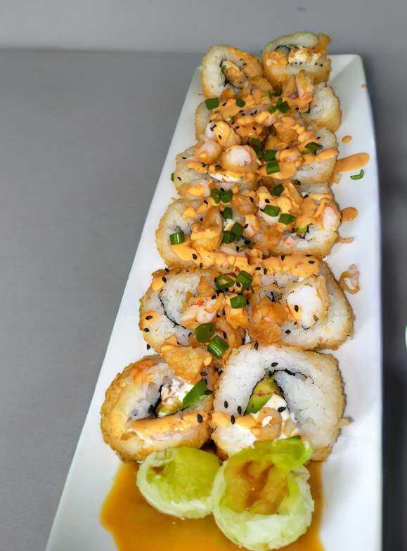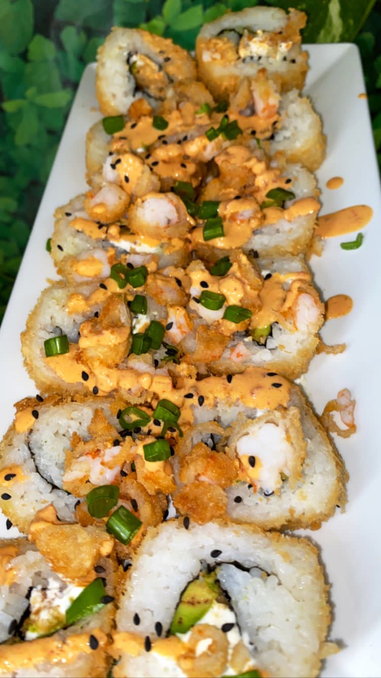 Por dentro Camaron Empanizado, Queso Crema y Aguacate,por fuera trozos de cámaron Empanizado y cebollin