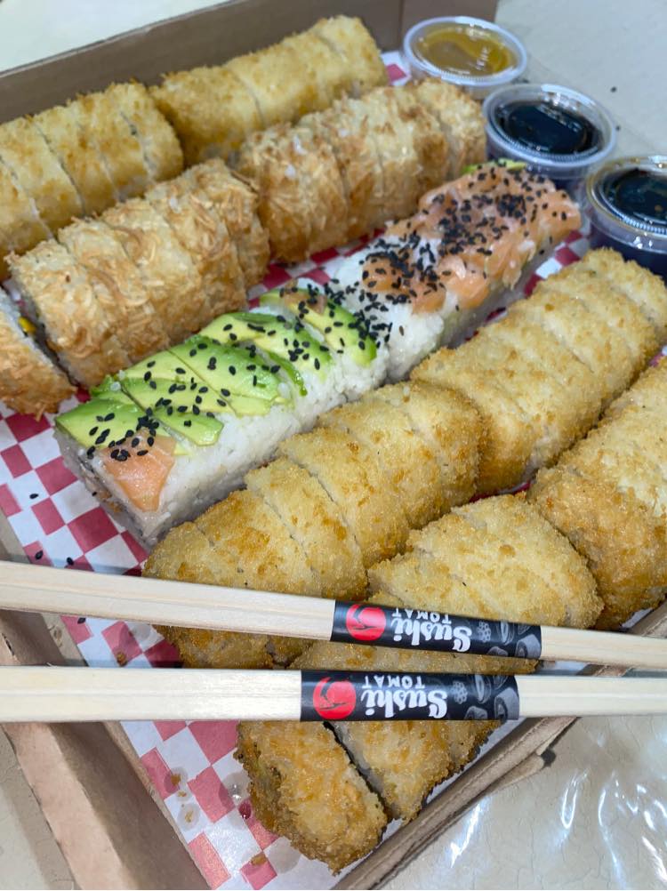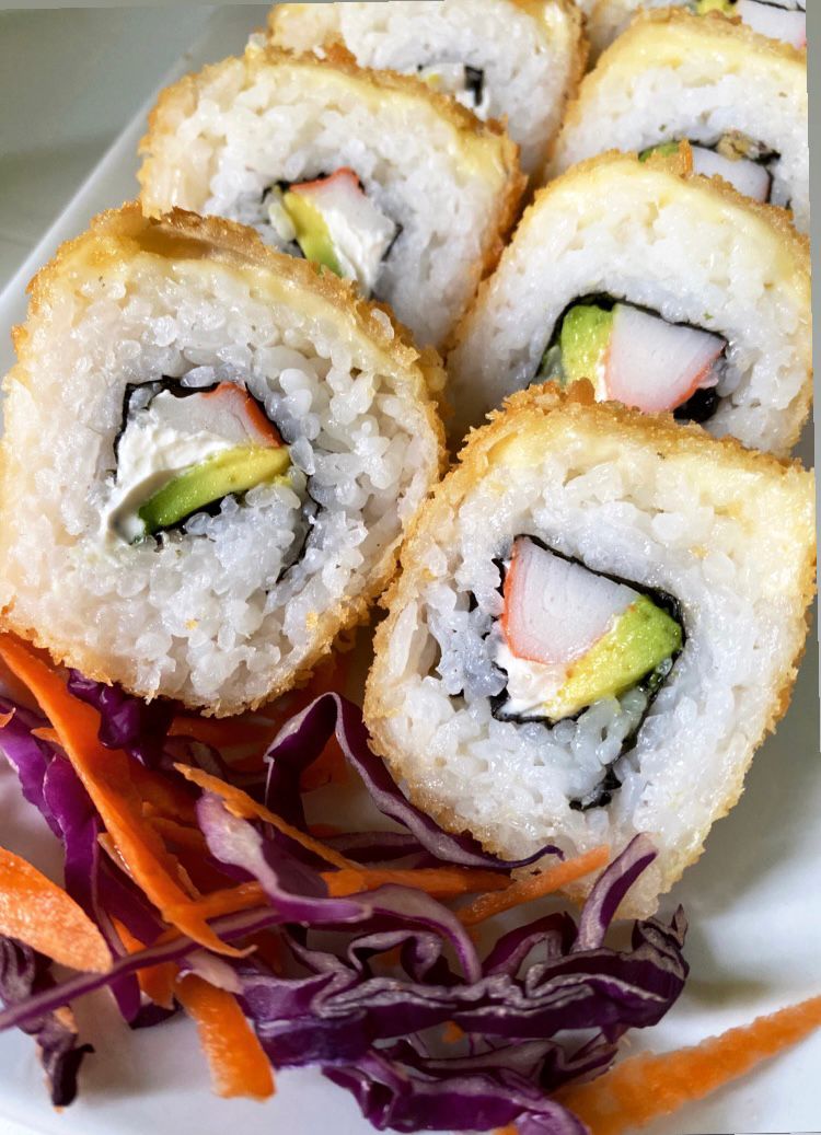 Sushi empanizado,por dentro Surimi, aguacate,queso crema por fuera salmón