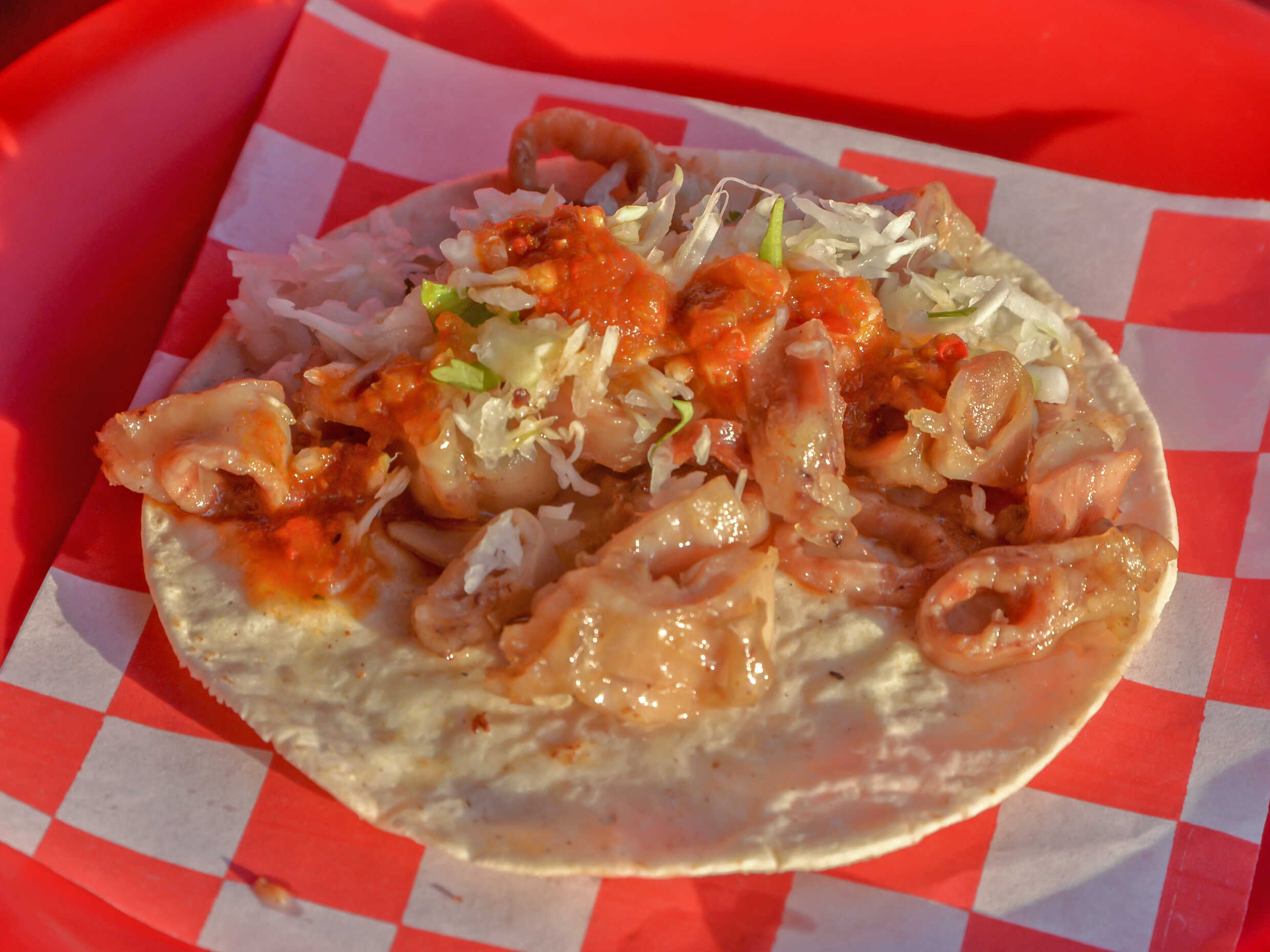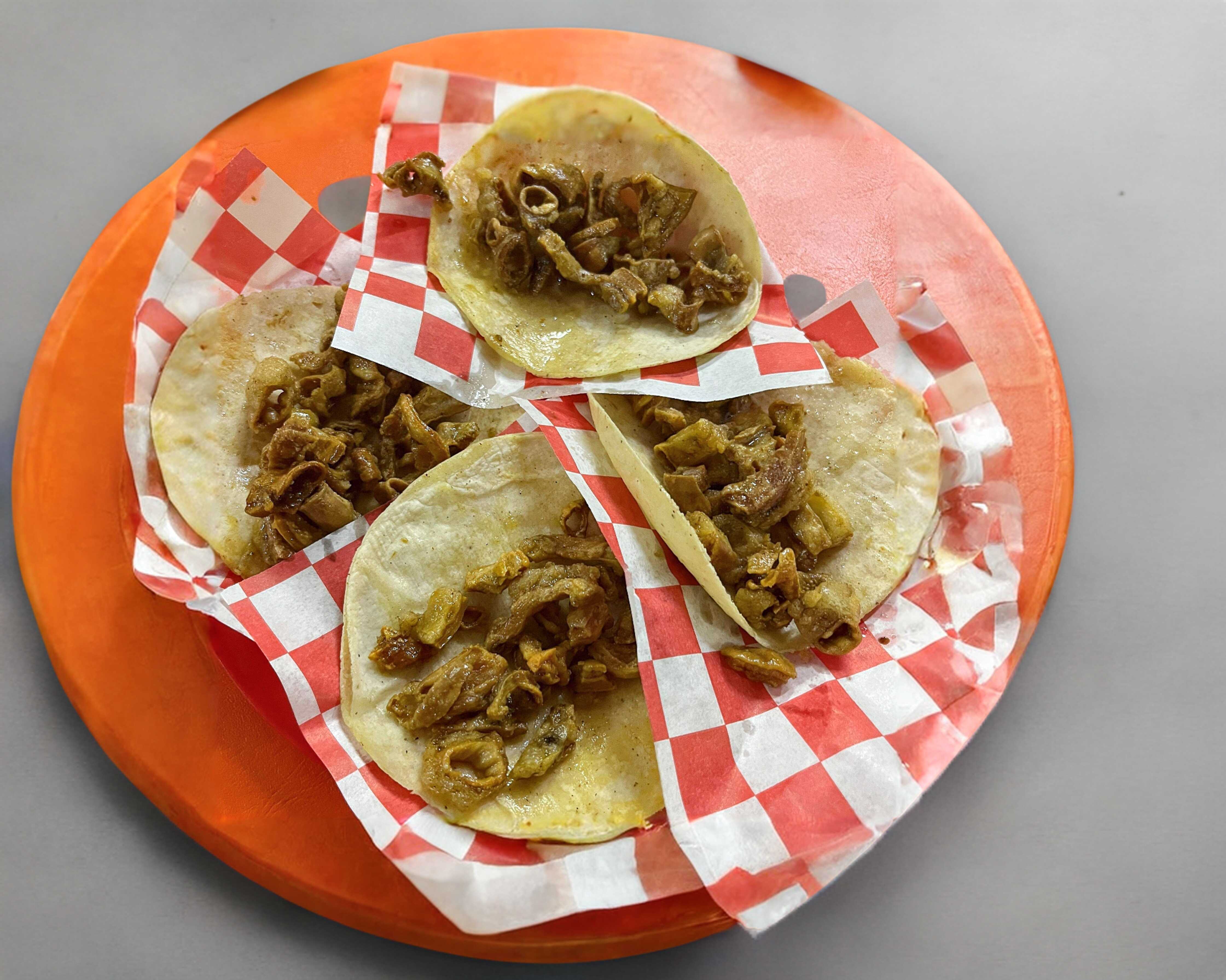 Taco de tripa dorada con tortilla de maíz, verdura y salsa.