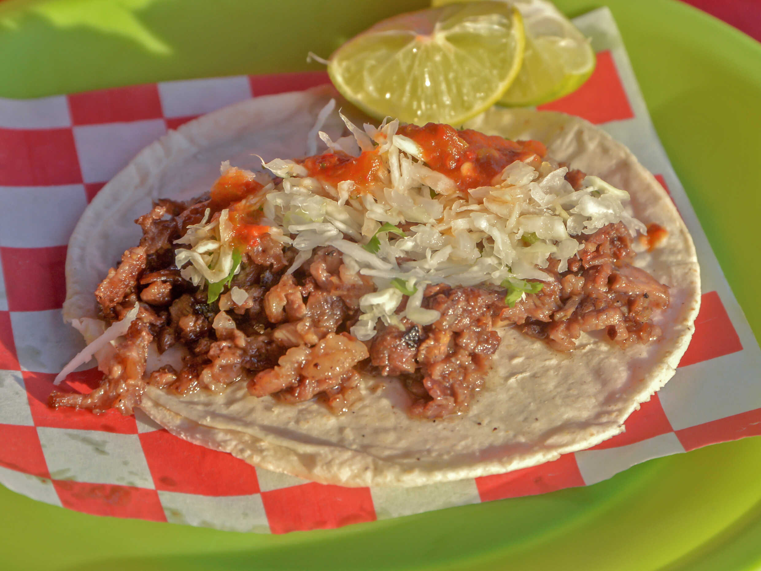 Taco de Carne Asada con tortilla de maíz, verdura y salsa.