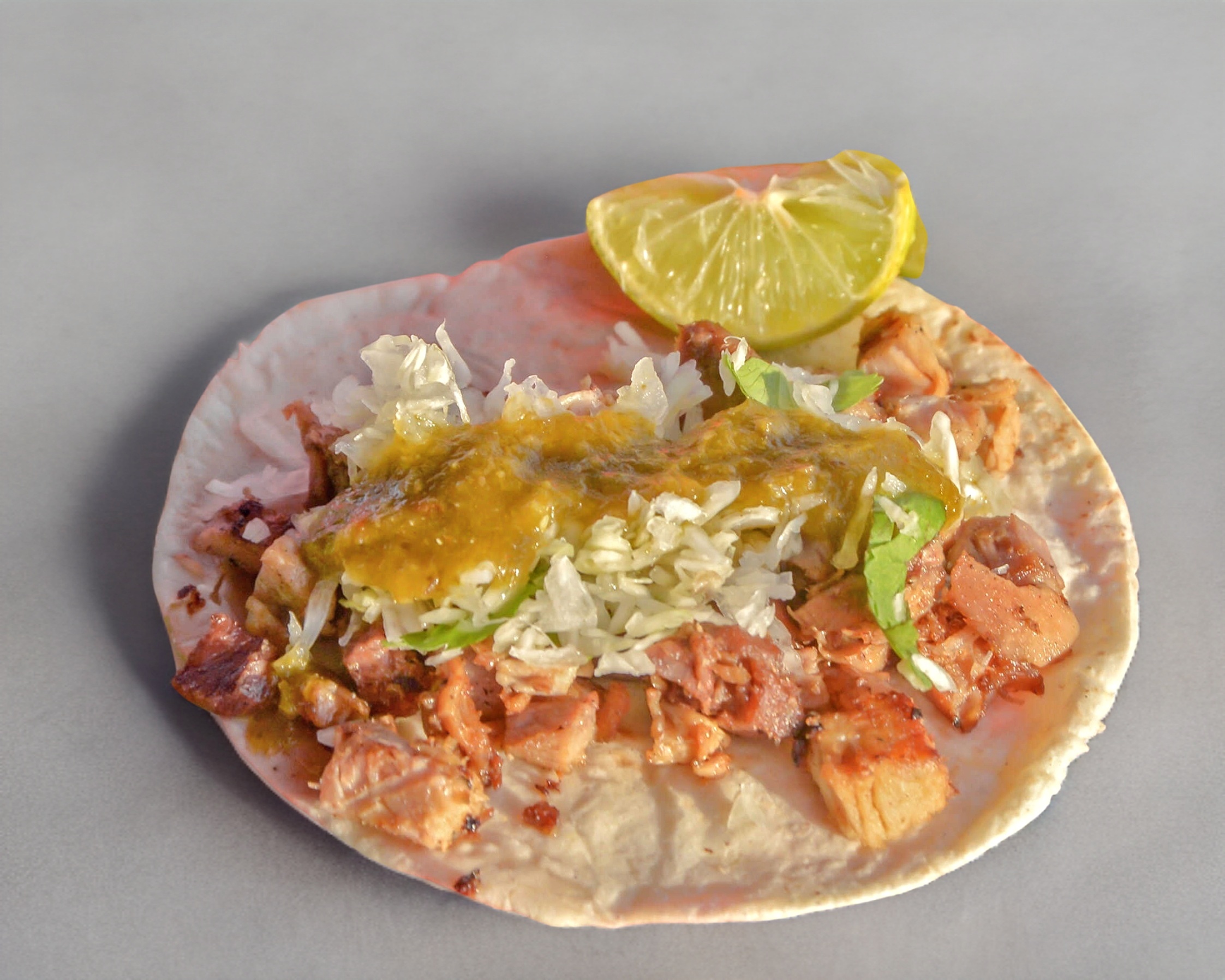 Taco de carnitas con tortilla de maíz, verdura y salsa.