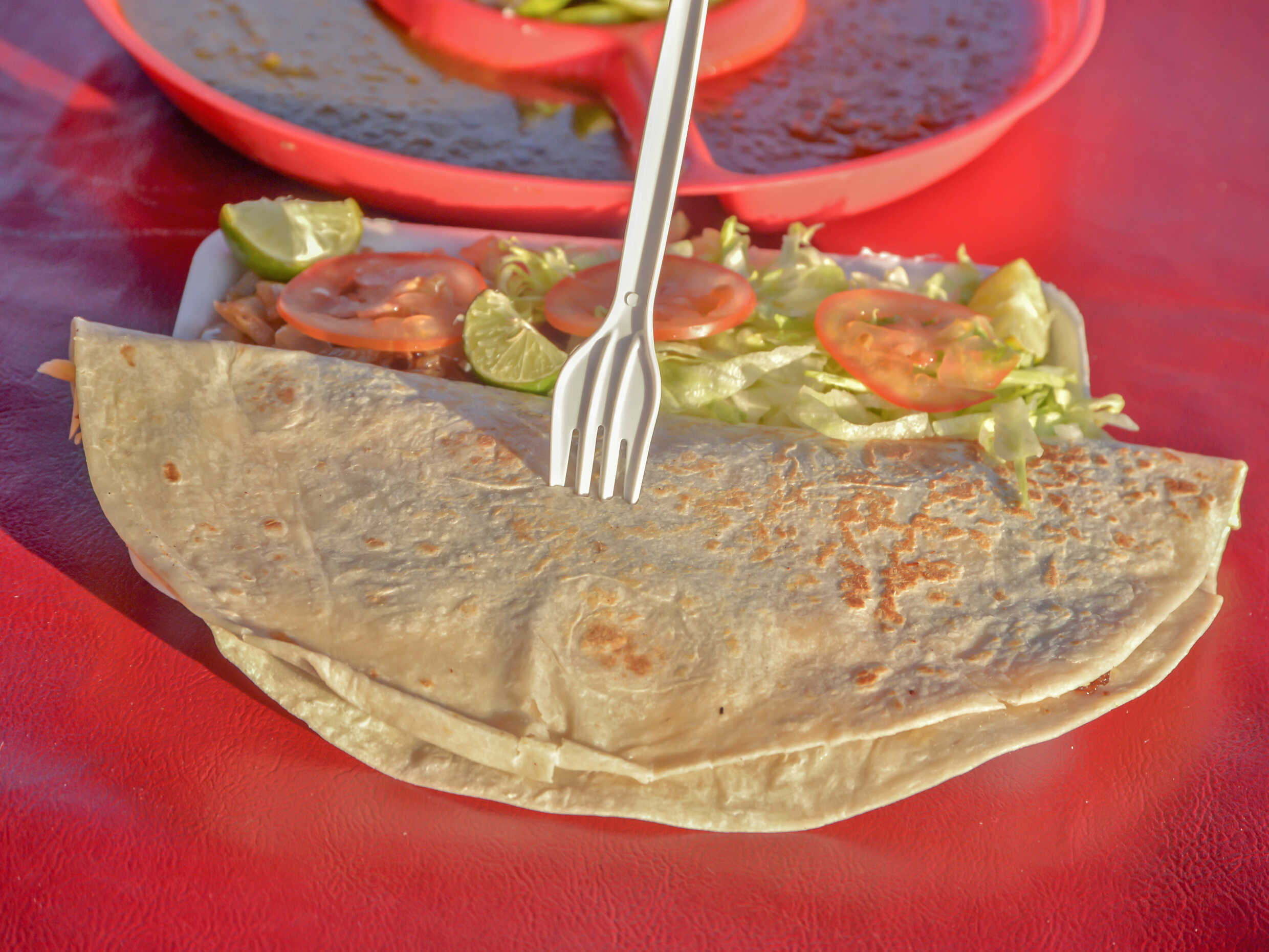 4 Quesadillas de Carne Asada con tortilla de maíz, cebolla asada, lechuga, tomate, limones y salsa.