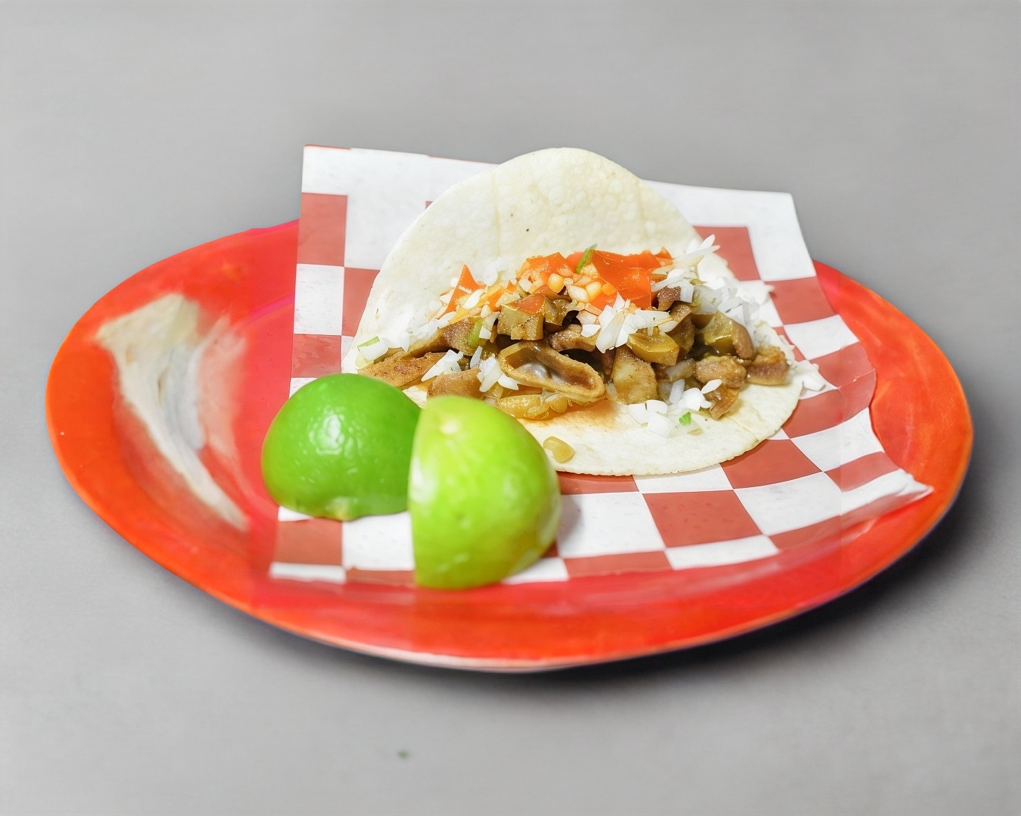 Taco tripa blanda con tortilla de maíz, verdura y salsa.