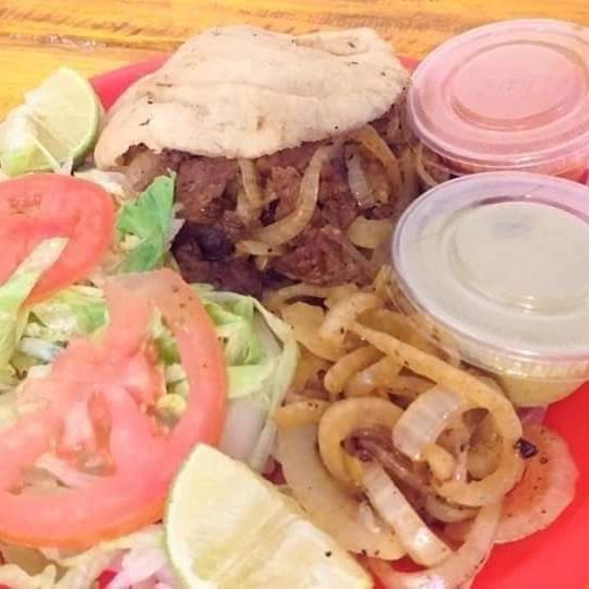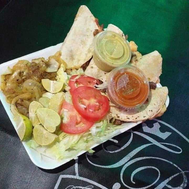 4 Quesadillas de Carne Asada, con tortilla de harina, cebolla asada,lechuga, tomate, limones y salsa.