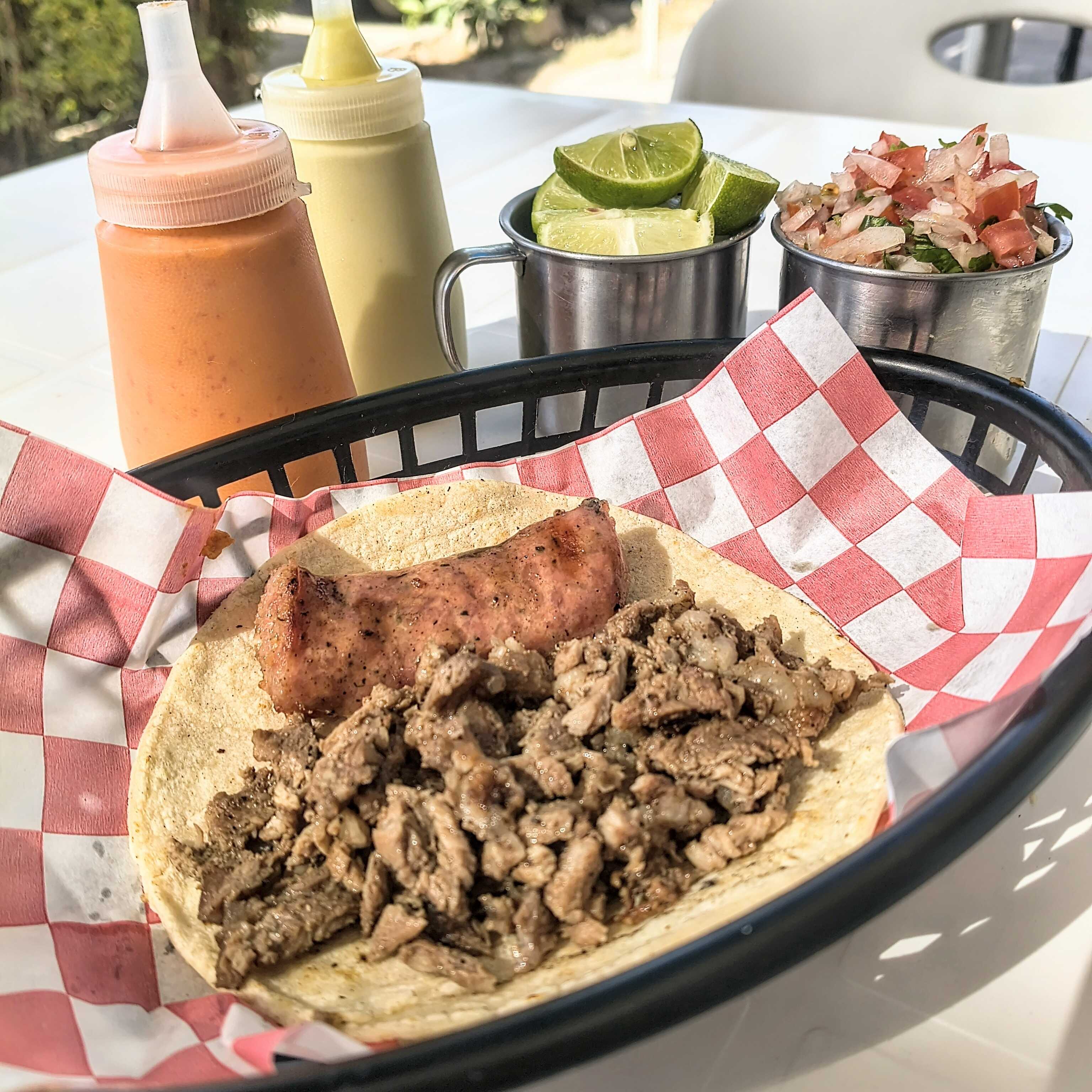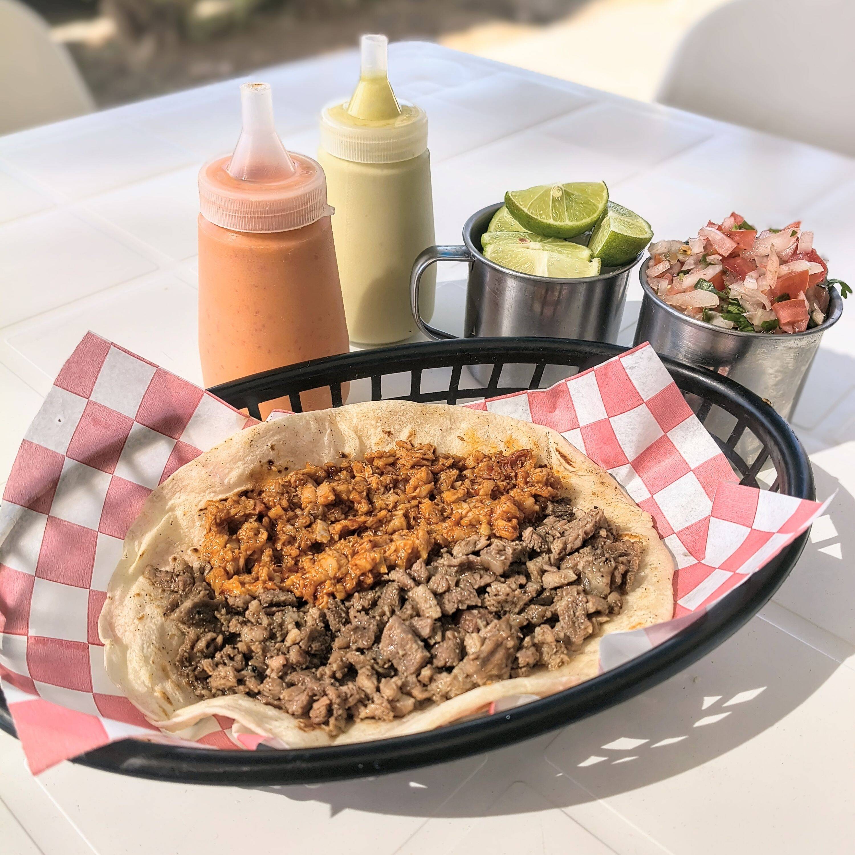 Taco de asada combinado con un ingrediente a elegir, en tortilla de maíz . Acompañado de pico de gallo, limón y salsa de la casa.