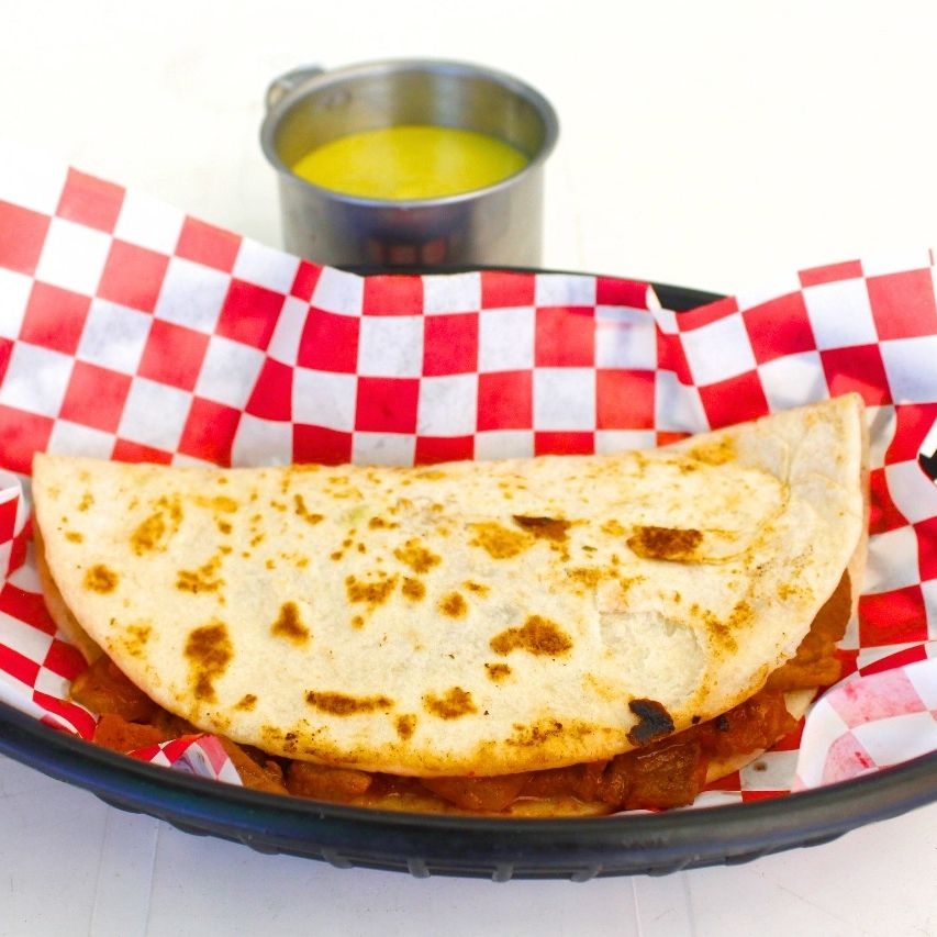 Gringa de carne asada en tortilla de harina casera. Acompañada de pico de gallo, limon y salsas de la casa.