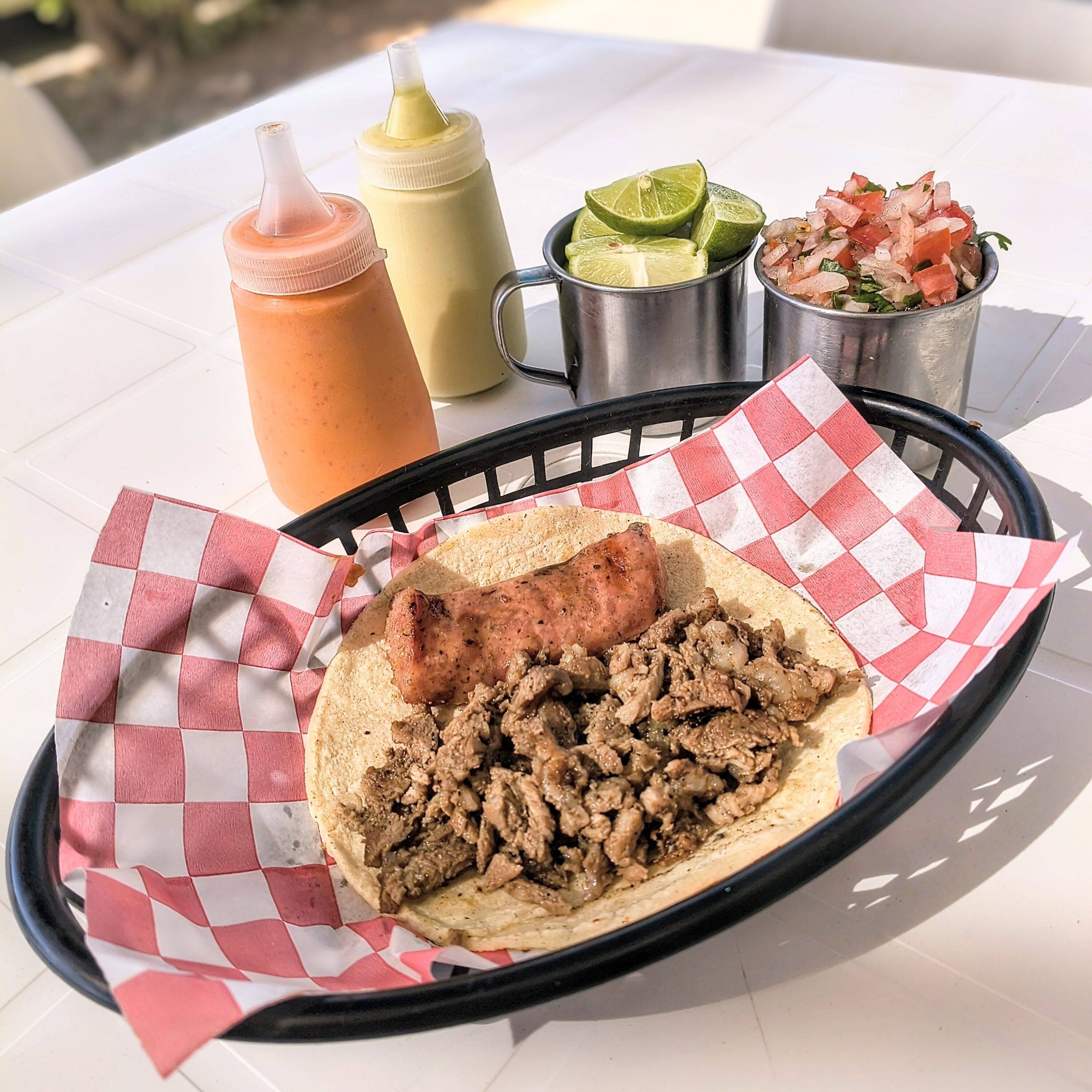 Taco de carne chistorra en tortilla de maíz. Acompañado de pico de gallo limon y salsa de la casa.