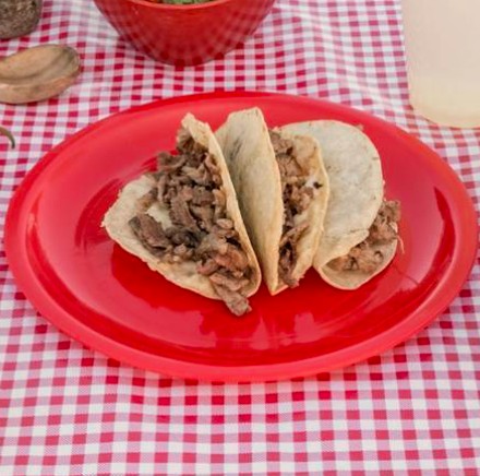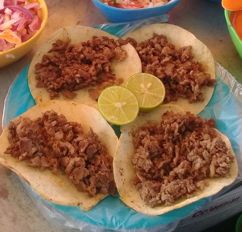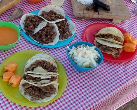 Harina o maíz, carne asada o sirloin acompañado de cebolla habanero, pico de gallo, 2 salsas de la casa y limones.