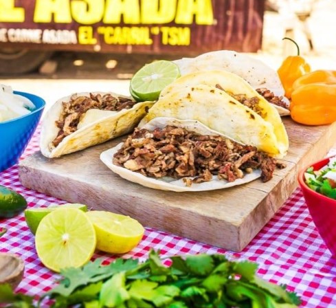 Porcion personal: 4 uds De harina o maíz, carne asada o sirloin acompañado de cebolla habanero, pico de gallo, 2 salsas de la casa y limones.