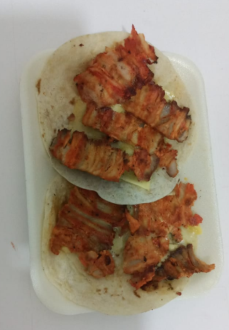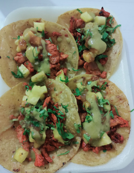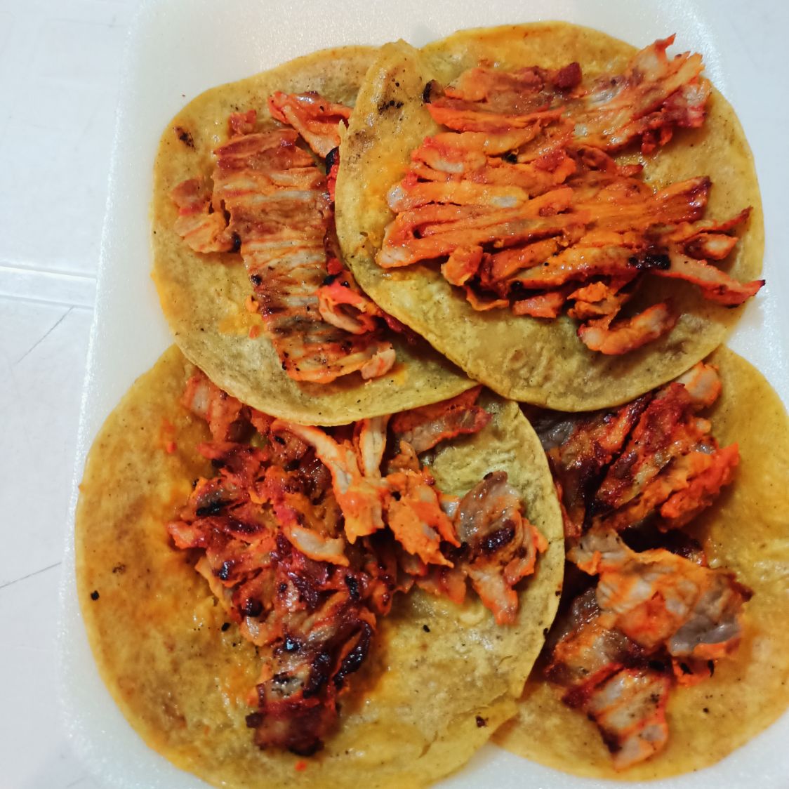 Orden de 4 tacos al pastor con tortilla sencilla, cebolla,salsas y piña.