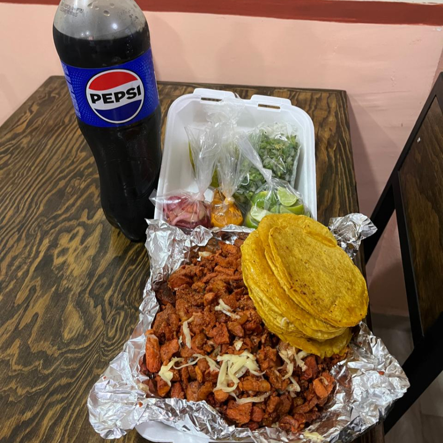 Kilo de carne al pastor tradicional acompañado de salsa, verdura, un kilo de tortillas y Pepsi de 1.5 L de regalo.
