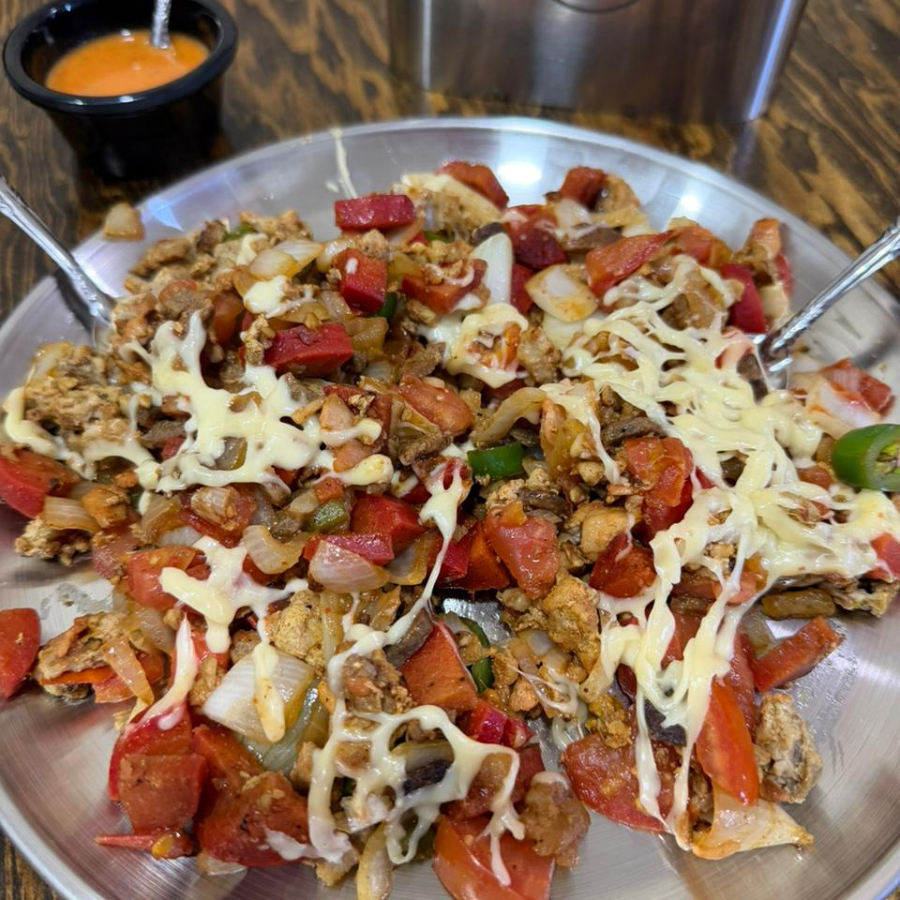 Platillo para 2 personas: Pastor, tocino y queso manchego. Salsa, verdura y tortillas
