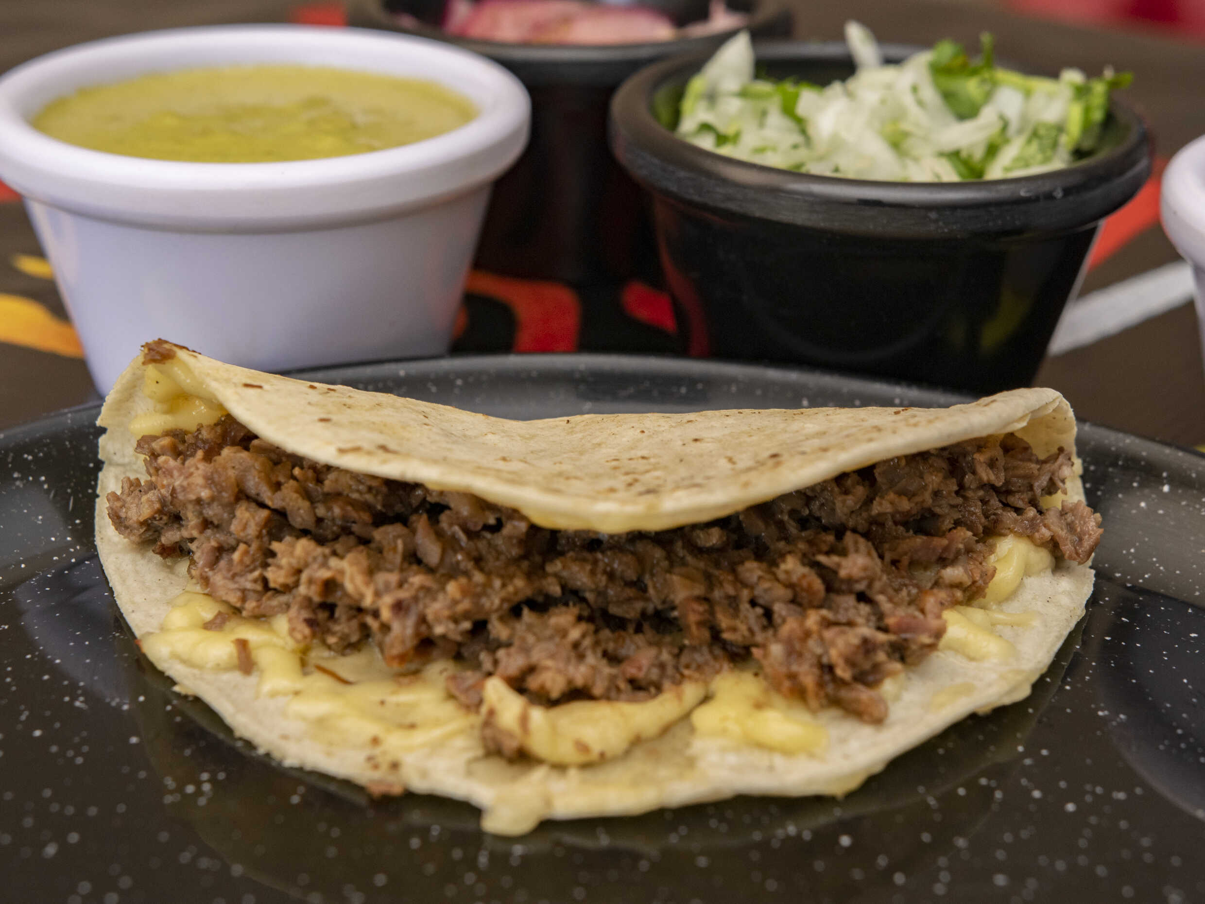 Taco de carne asada (50 gramos ) con queso en tortilla de maíz y salsa de la casa.