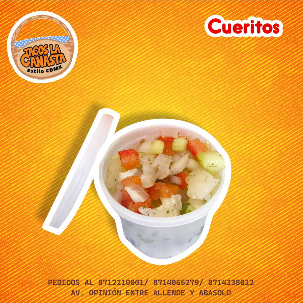 Cueritos curtidos 1/2 lt, cueritos, pepino, tomate y cebolla.
