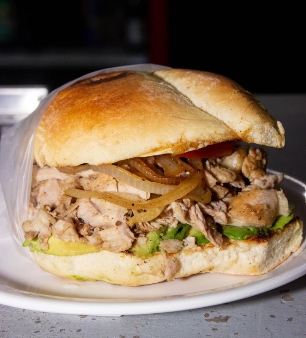 Pan francés, mayonesa, aguacate, tomate, cebolla asada, chile y buche