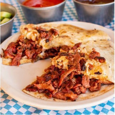Mezcla de carnes con queso fundido en tortilla de harina.