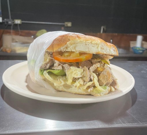 Pan francés, mayonesa, aguacate, tomate, chile, cebolla asada y carnitas