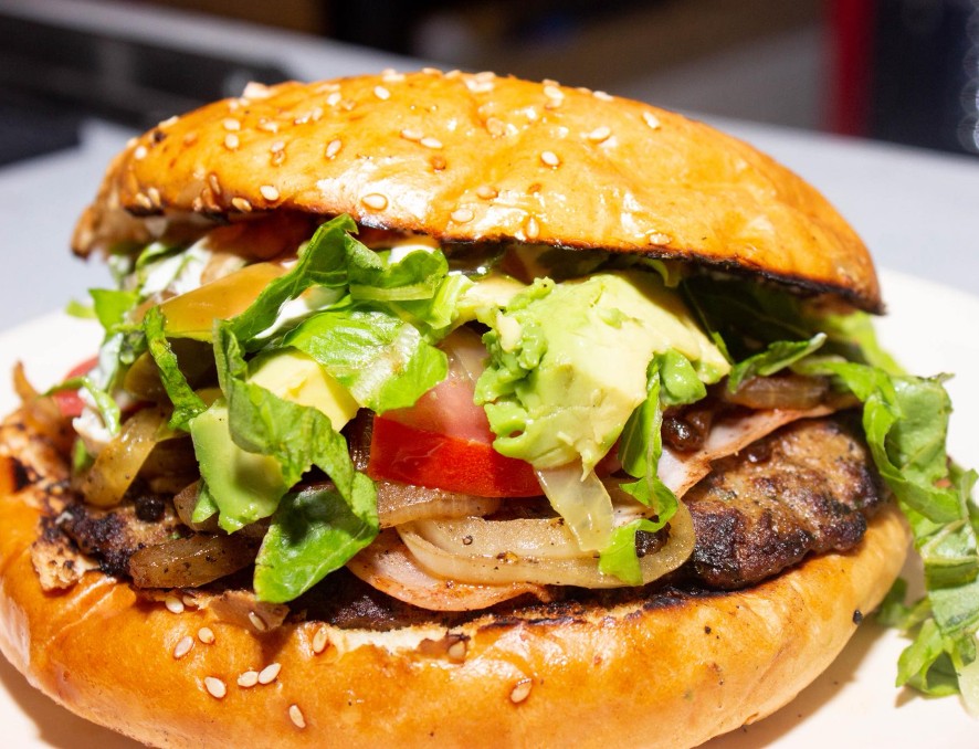 Carne recién hecha con lechuga, tomate, cebolla, chile, aderezos y aguacate.