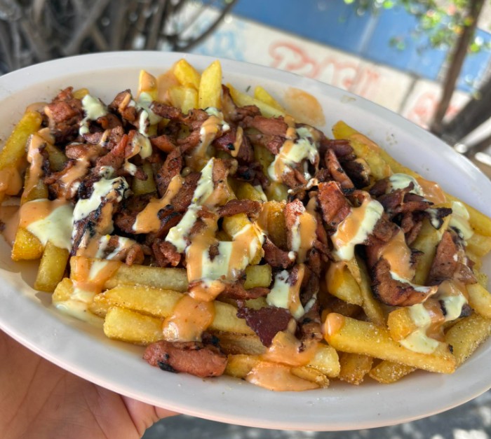 300 g De papas a la francesa con pimienta, limón y carne al pastor con aderezos (ranch, chipotle, cilantro).