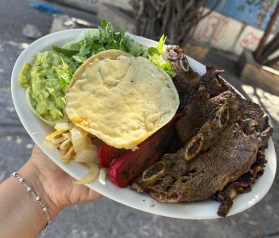 400 g De costilla cargada, guacamole, 2 salchichas asadas, 1 tostada con queso, lechuga, cebolla asada y tortillas y salsa.