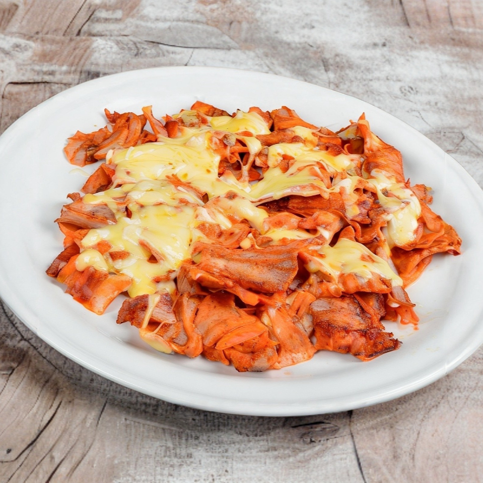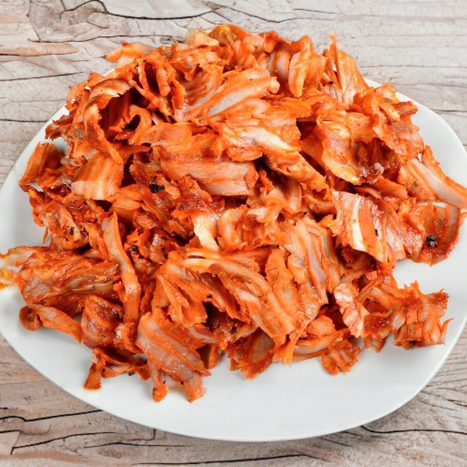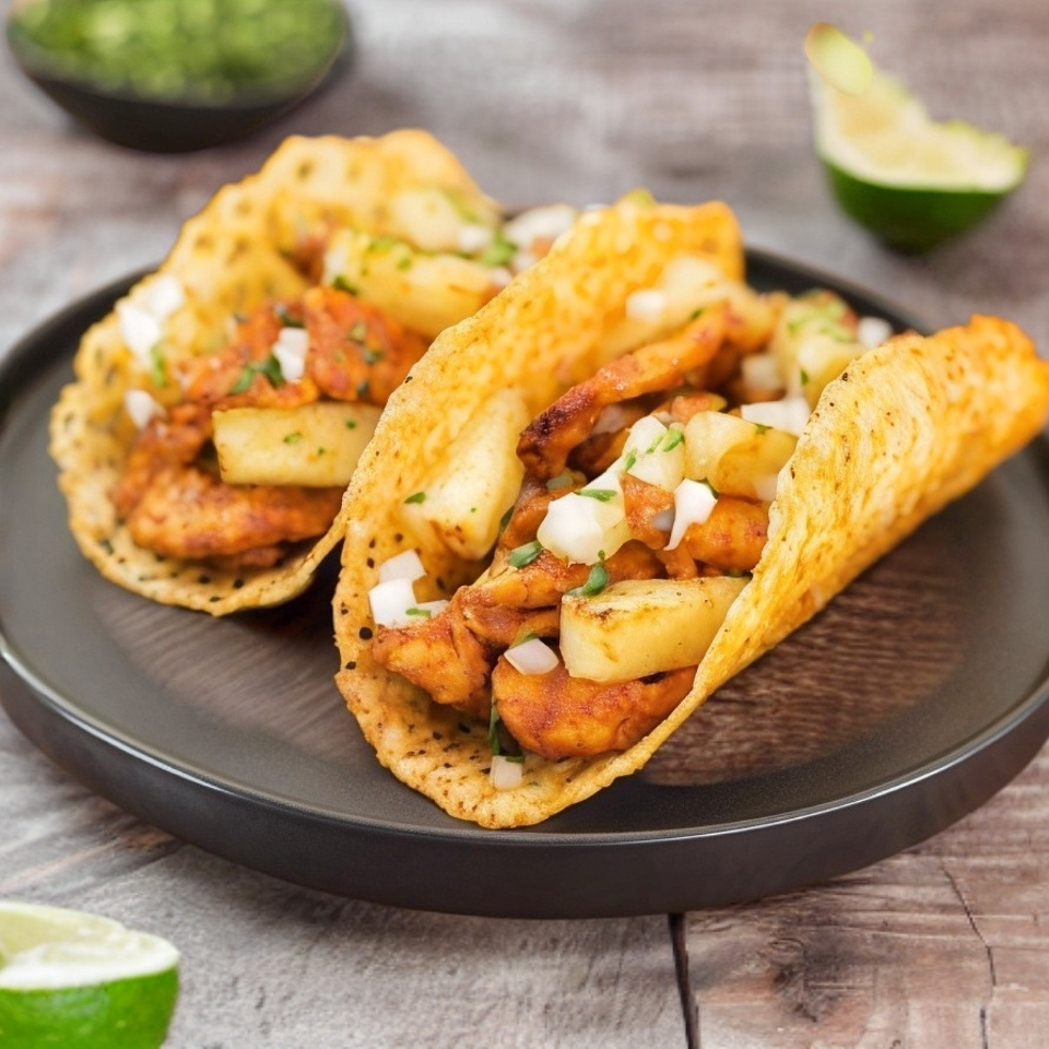 carne al pastor y queso gratinado, servido con tortilla de maíz