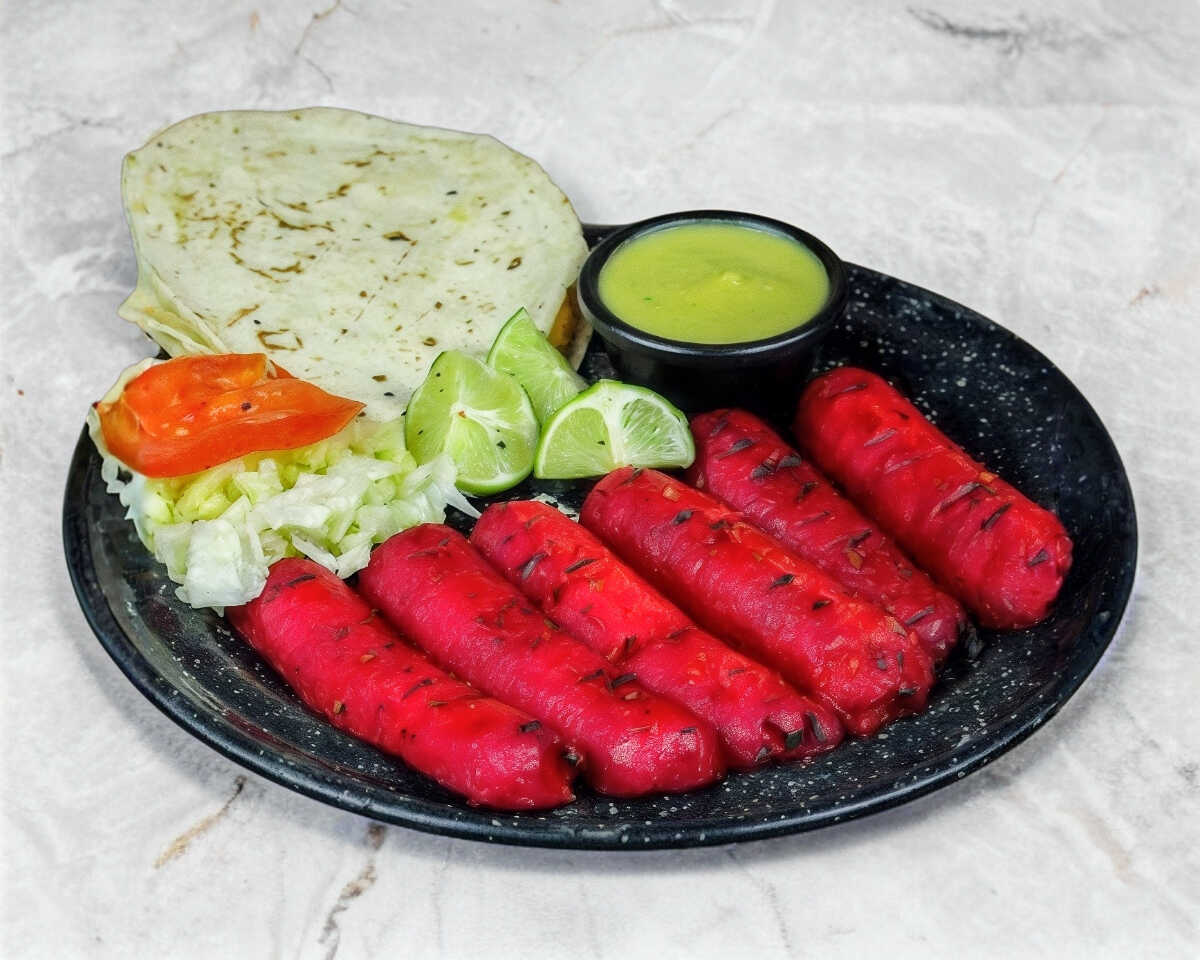 Orden de salchicha con su cebolla, tortillas, su salsas y verduras aparte