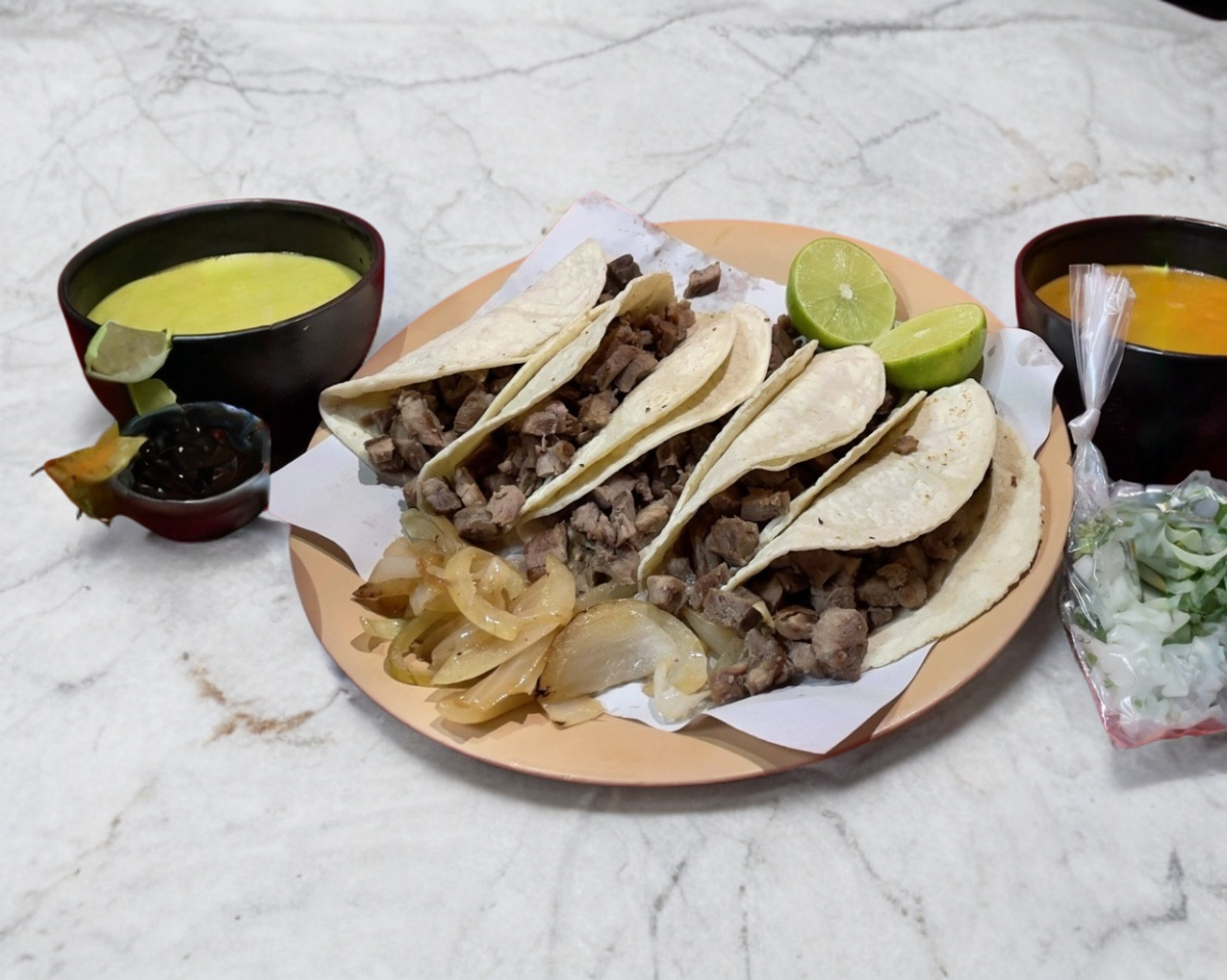 4 tacos de carne asada con su cebolla asada y sus salsas y verduras aparte