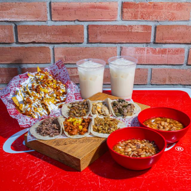 Ideal para compartir entre 2 personas. Incluye: 6 tacos de especialidad, nachos de especialidad, 2 Frijoles Charros y 2 Aguas Frescas de 750 ml.
