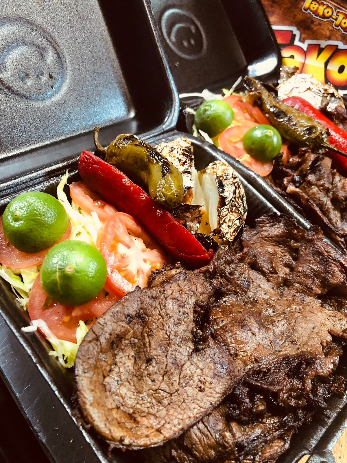 Papa asada con mantequilla, crema, queso cheddar, queso amarillo fundido y carne asada acompañada con totopos y salsa.