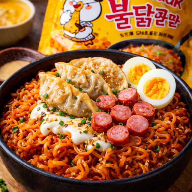 fideos instantáneos con huevo cocido, Gyosas de res y salchicha