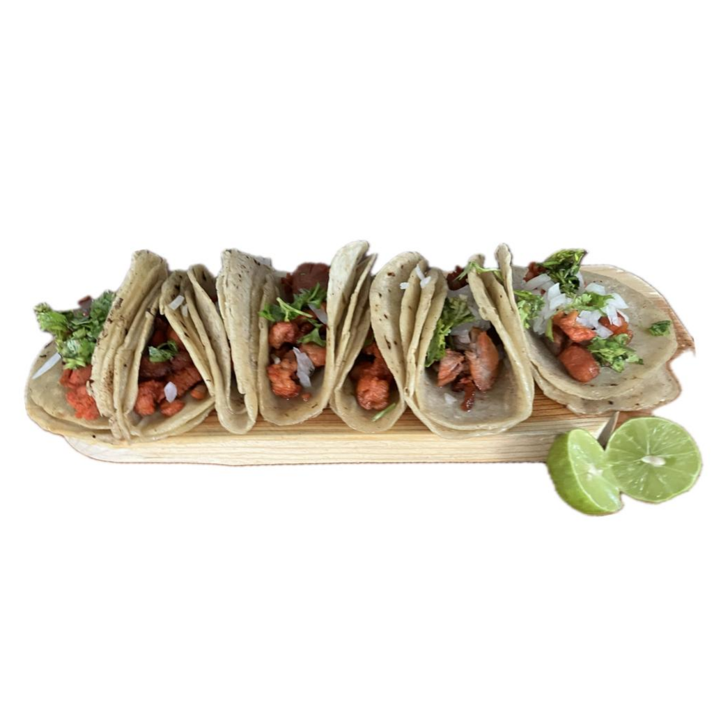 6 Tacos al pastor con tortilla de maiz amarillo (90gr de carne) + Agua Fresca de Jamaica 500ml, incluye una bolsa de verdura de 50gr + bolsa de salsa de 35ml