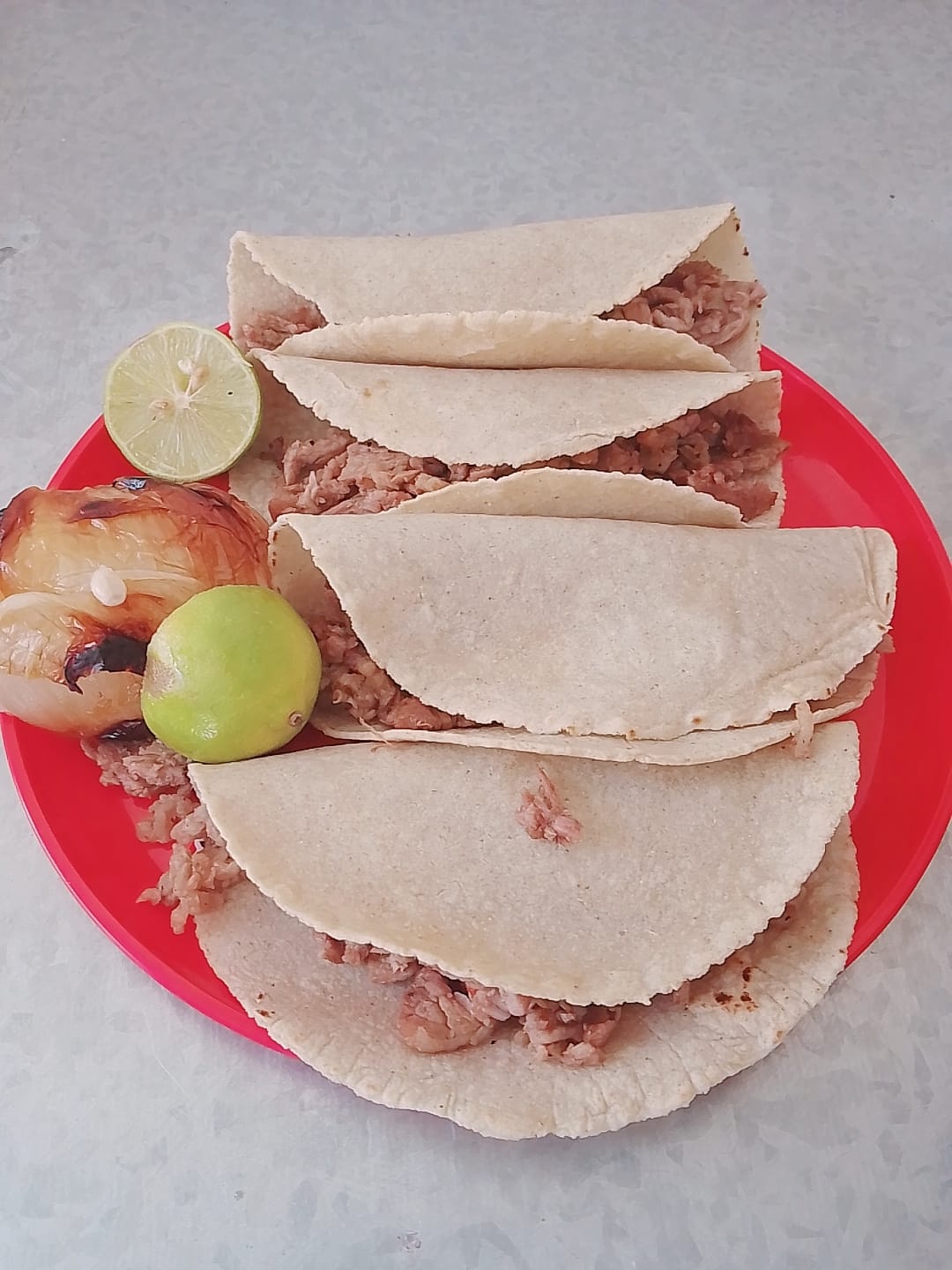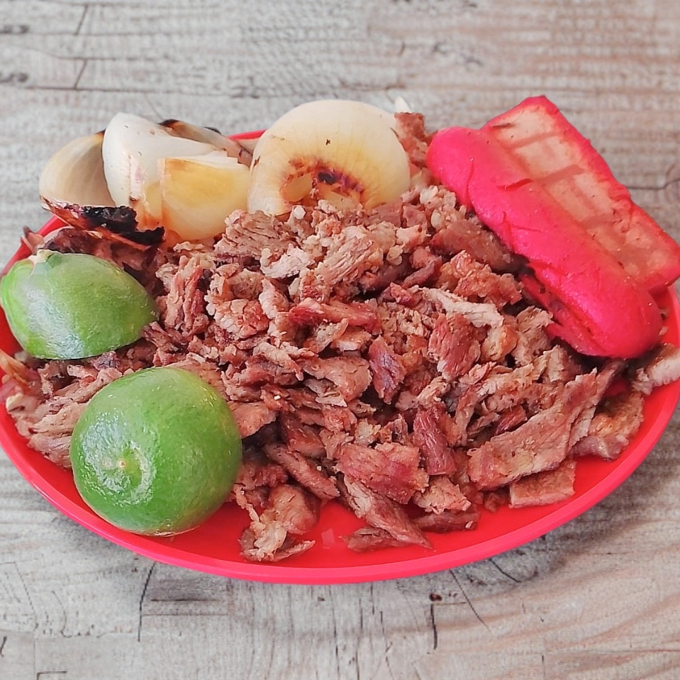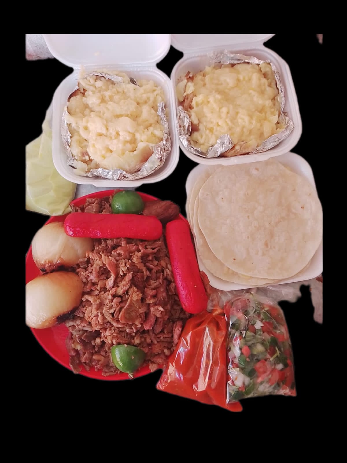 Carne asada, cebolla, tortillas, salsa roja, guacamole, y pico de gallo.