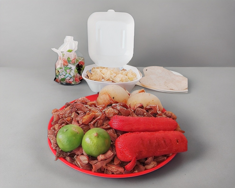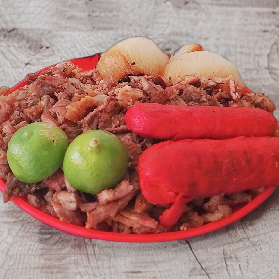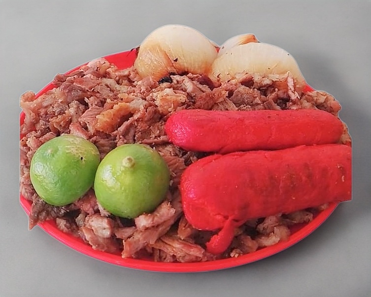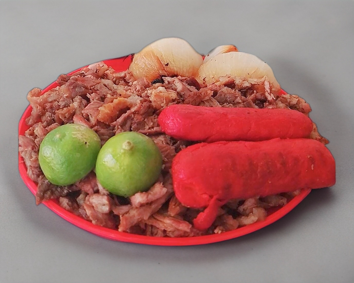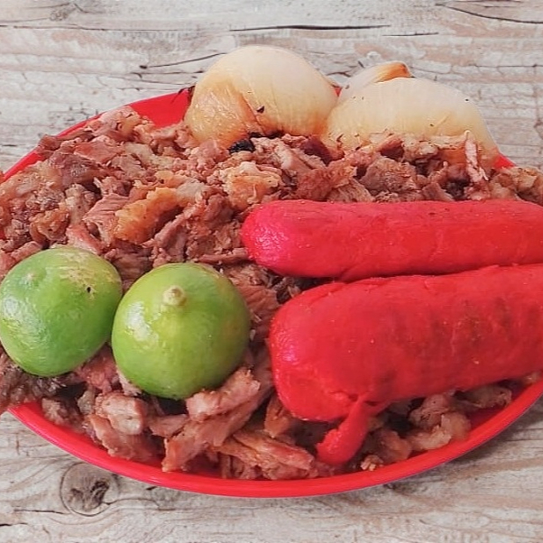 Carne asada, salchicha asada, cebolla, tortillas, salsa roja, guacamole, y pico de gallo.
