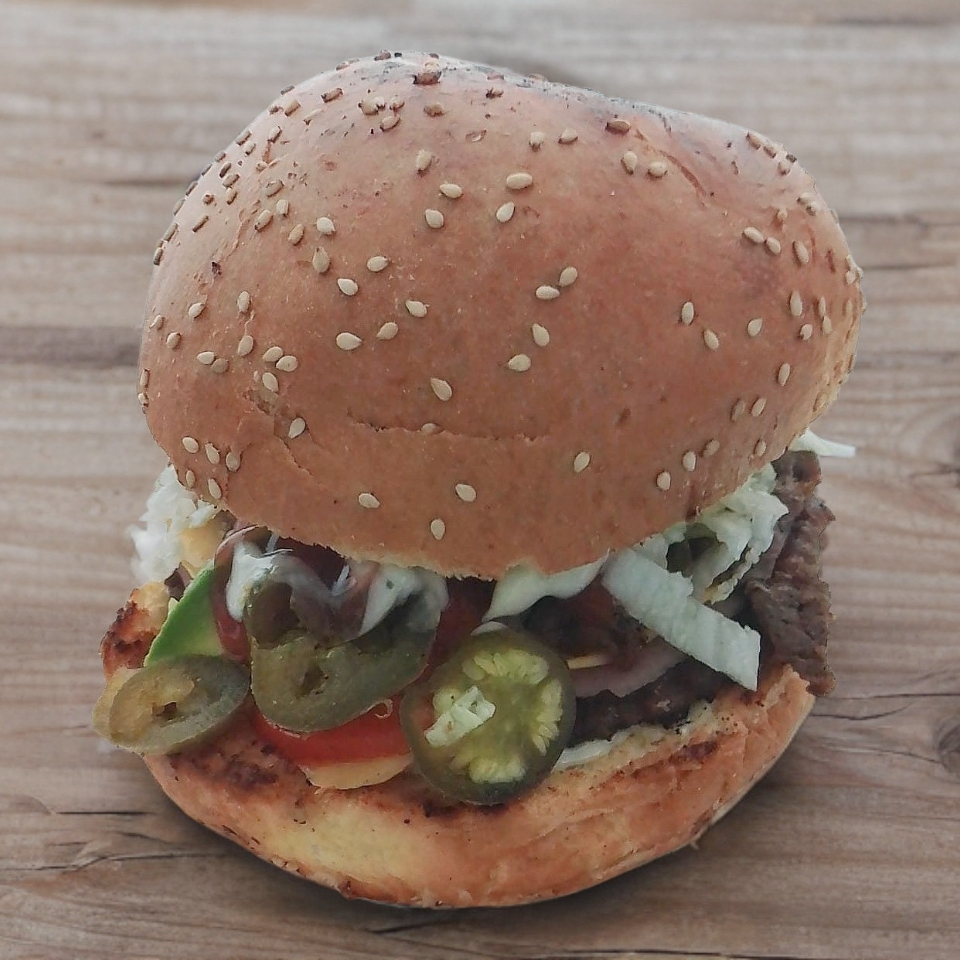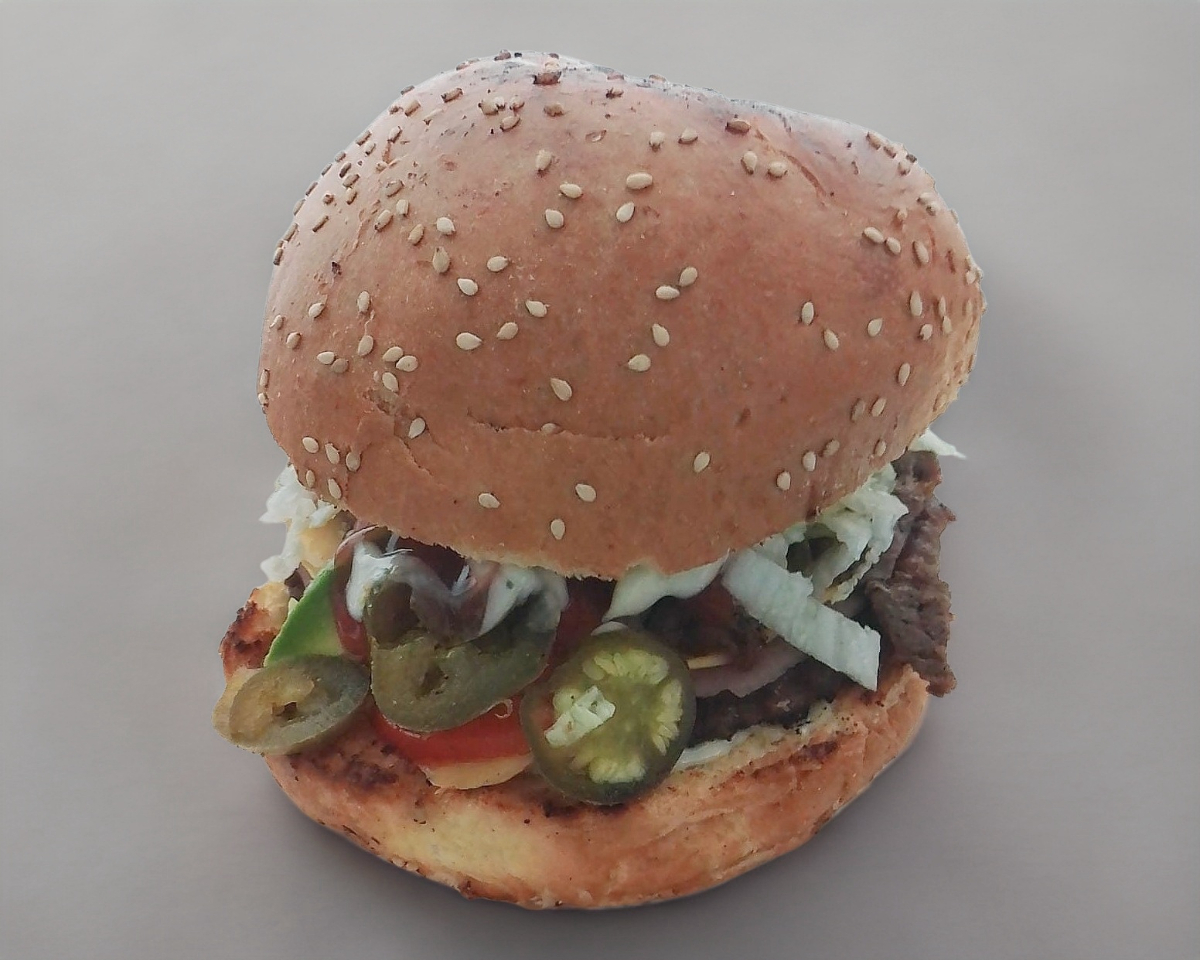 Pan, carne, queso, jamón, tocino, aguacate, carne asada.