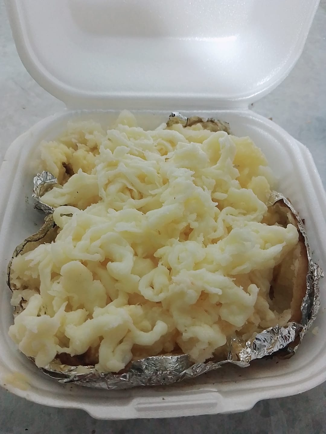 Papa asada, queso, mantequilla , y salsas.
