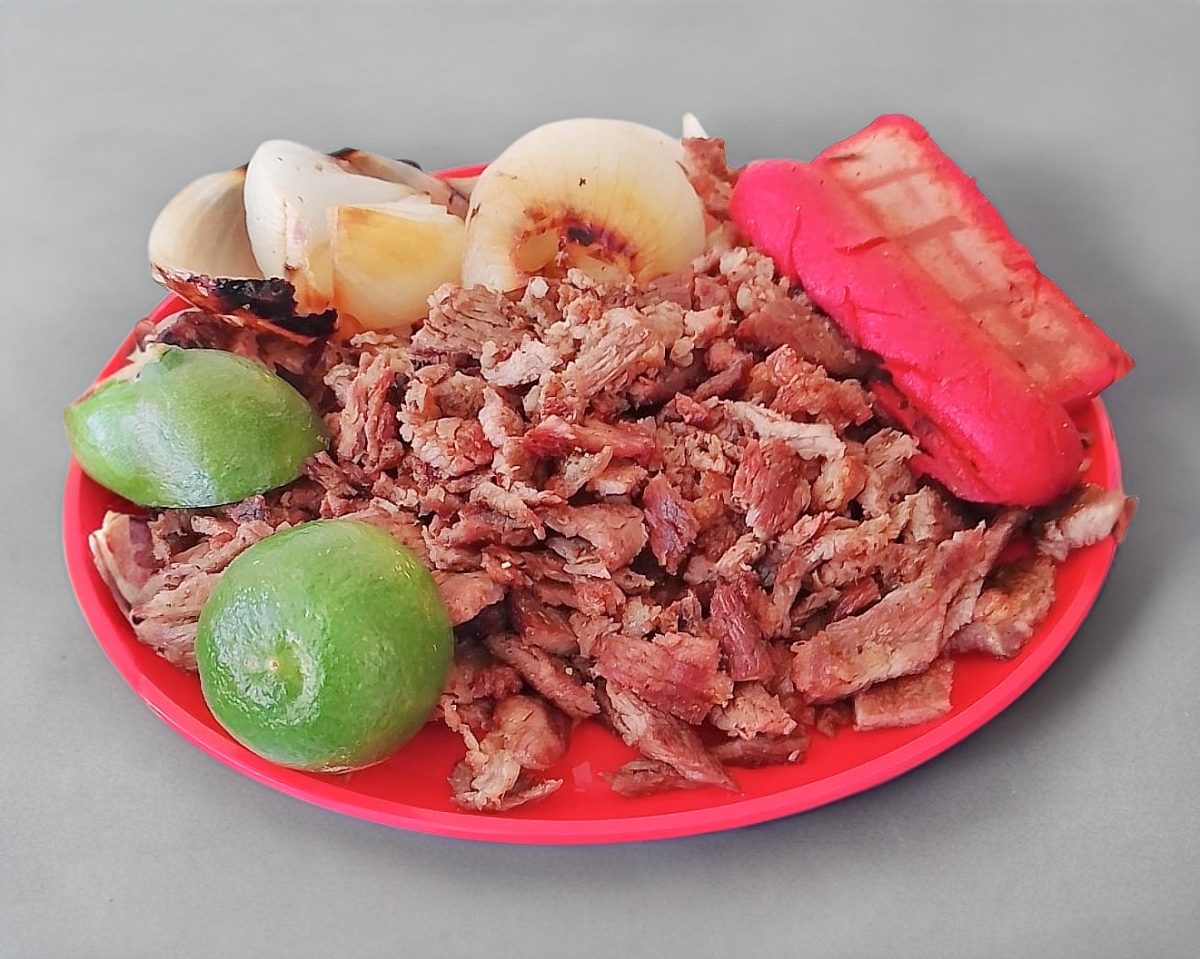 Carne asada, tortilla, cebolla, salsa roja, guacamole, y pico de gallo.