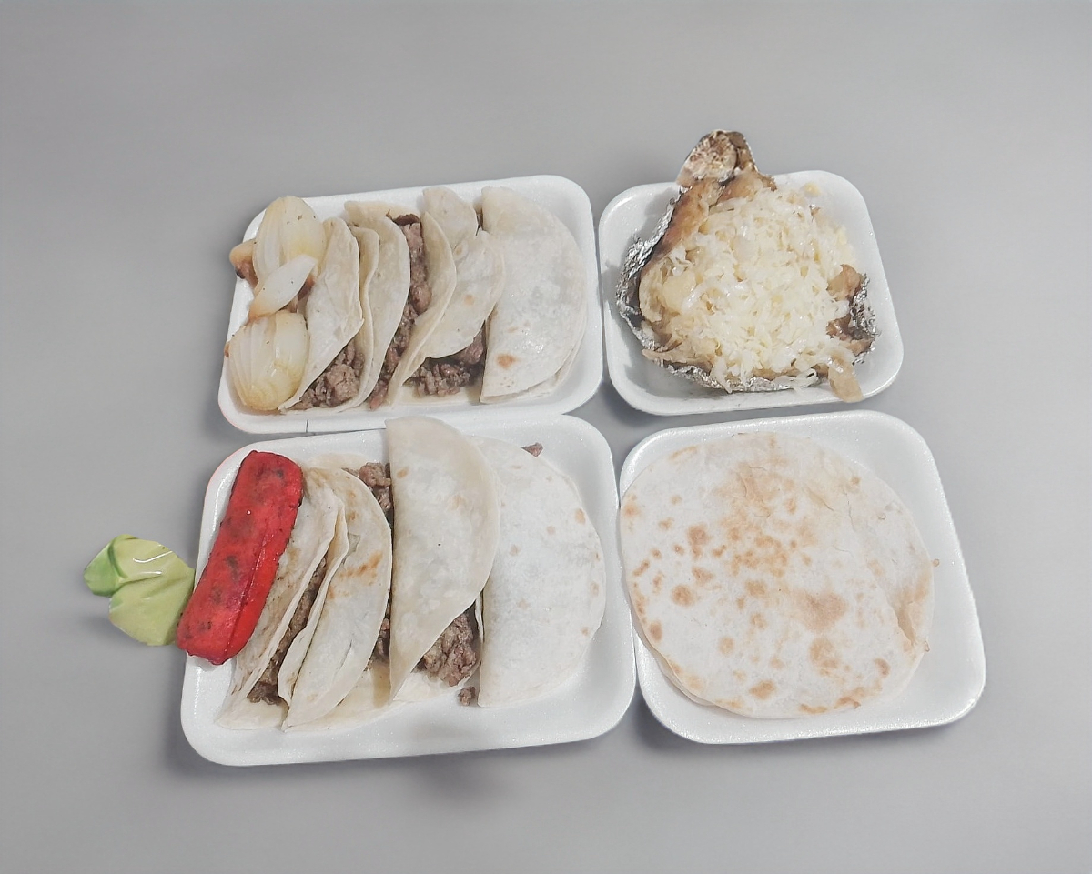 8 Tacos,1 papa sencilla,1 quesadilla sencilla,1 salchicha asada, cebolla asada, salsa roja, guacamole, y pico de gallo.