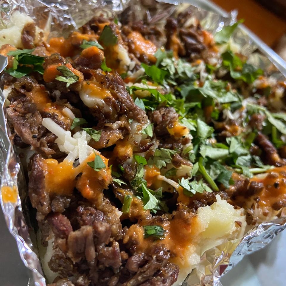 Jugosa papa al horno rellena con queso y carne asada. El acompañamiento perfecto para tu orden.