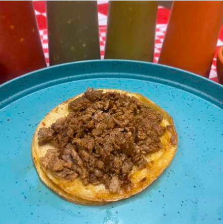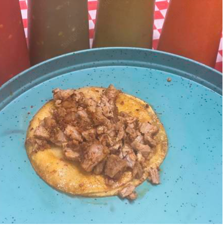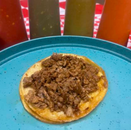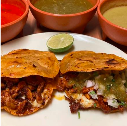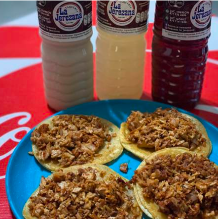 4 Tacos de adobada de tortilla de maíz y agua de sabor a elegir (horchata, jamaica o pepino limón).