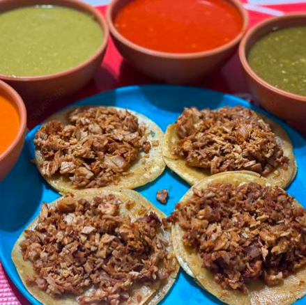 Hechos con tortilla doble de maíz con carnitas de puerco.