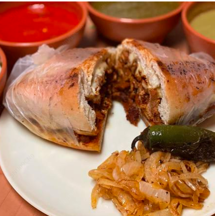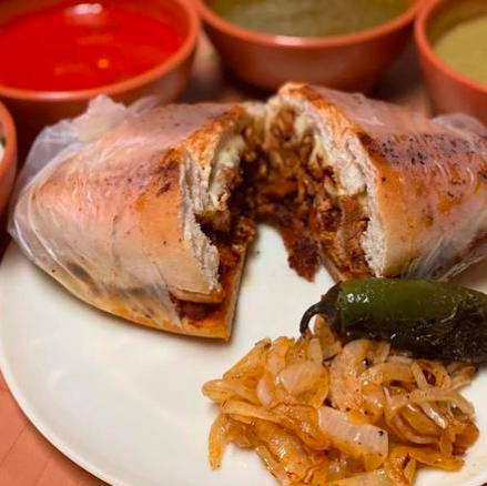 Pan francés con carne adobada, verdura y aderezos opcionales.