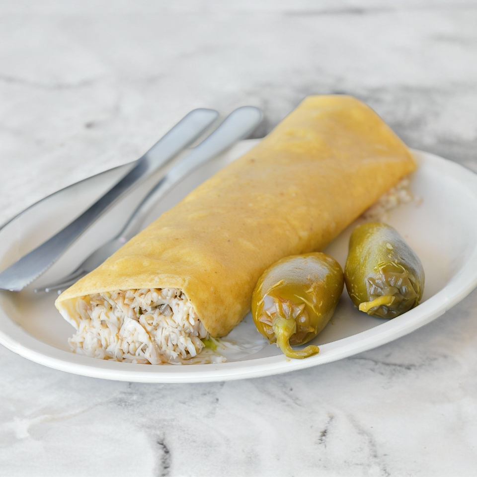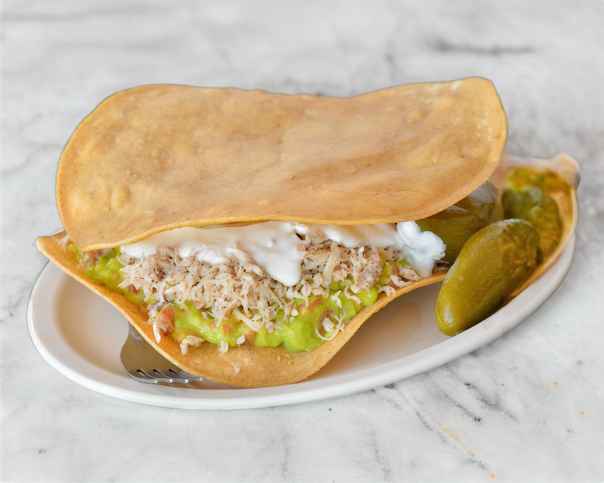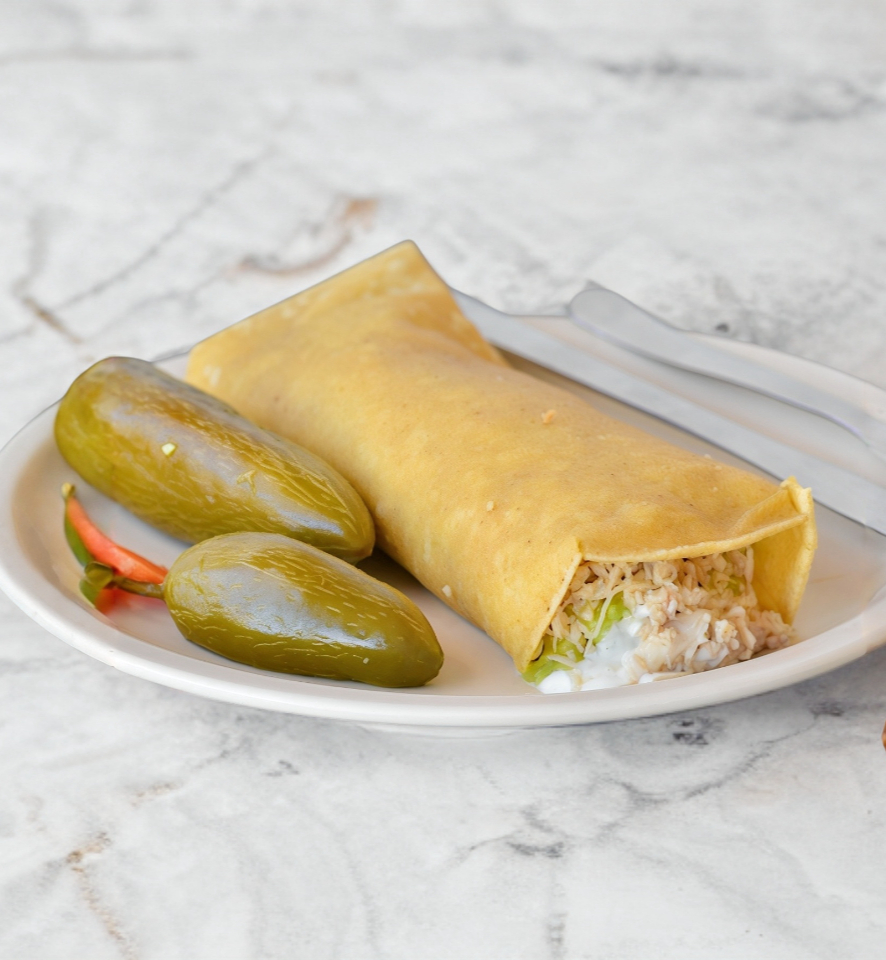 Delicioso taco gigante, tortilla en aceite, pechuga de pollo, guacamole de la casa y crema. Una delicia.